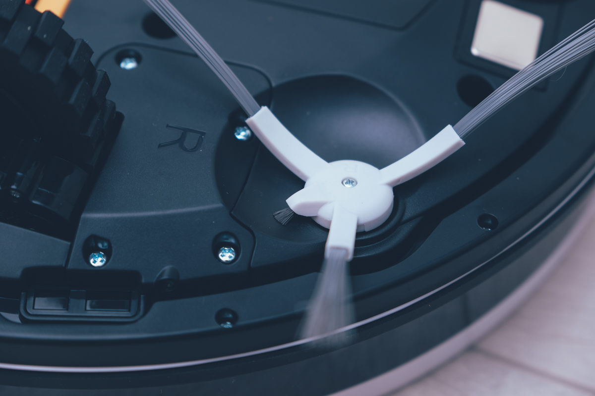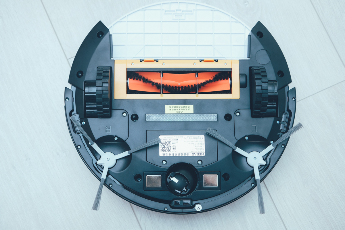 底部的邊刷有二邊,現在大多掃地機都只剩一邊,但其實只有一邊邊刷還是有小缺點的,比如像是顆粒狀的垃圾很容易被撥走後清掃不乾淨,但有雙邊邊刷的話,大致上不太會有這樣的問題。在前側的三邊都設有防墜落偵測器,如果是用在透天厝使用,也不用擔心樓梯的問題。
