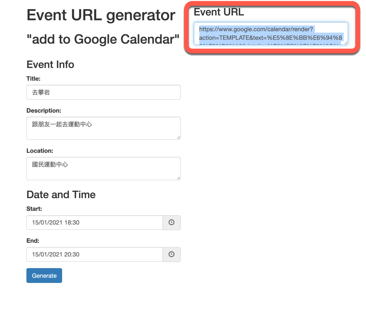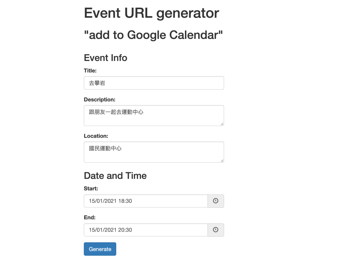 網站:https://decomaan.github.io/google-calendar-link-generator/這是放在 Github 上的作品,很實用的小工具,進入後只要輸入行事曆的內容、時間等,就可以產生連結。