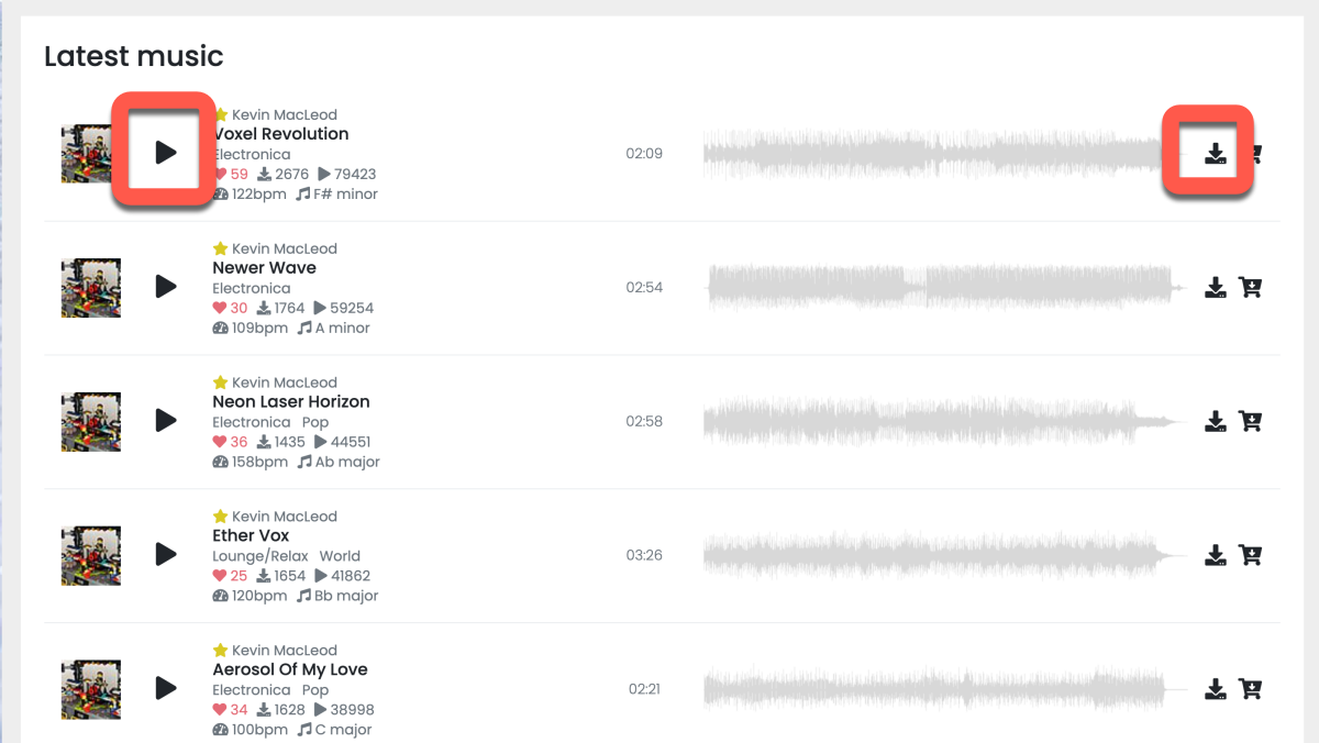 進入後就可以查看該類別的所有音樂,按下 Play 圖示就可以試聽,右邊按下載圖示就可以進入下載。