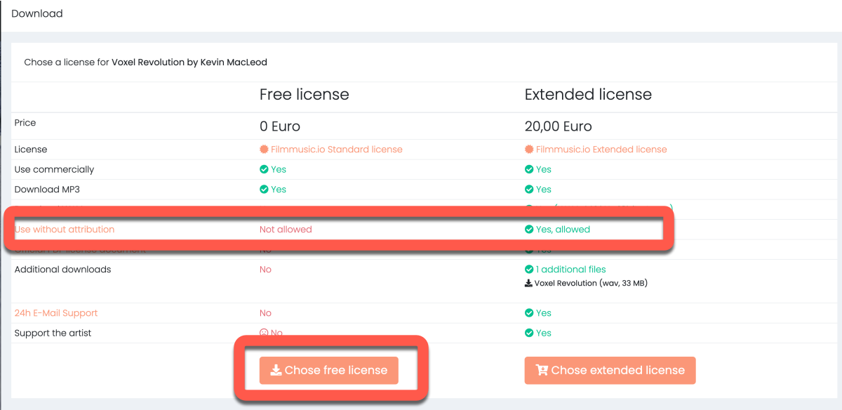 在下載時也可以看到免費授權跟付費授權差在哪裡,其中一項就是免費授權使用的話需要標註來源,重點就是這個,所以作者其實真的是佛系來著,因為付費授權,以音樂每首要 2000 歐元來說,應該是不太可能有人會購買(一般音樂素材 100 美金已經蠻多的了)。