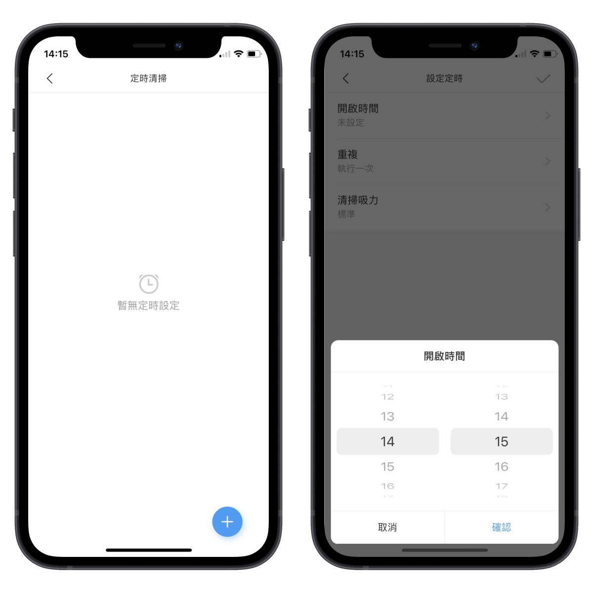 定時清掃的部份,可以選擇時間、重複的時間以及吸力。