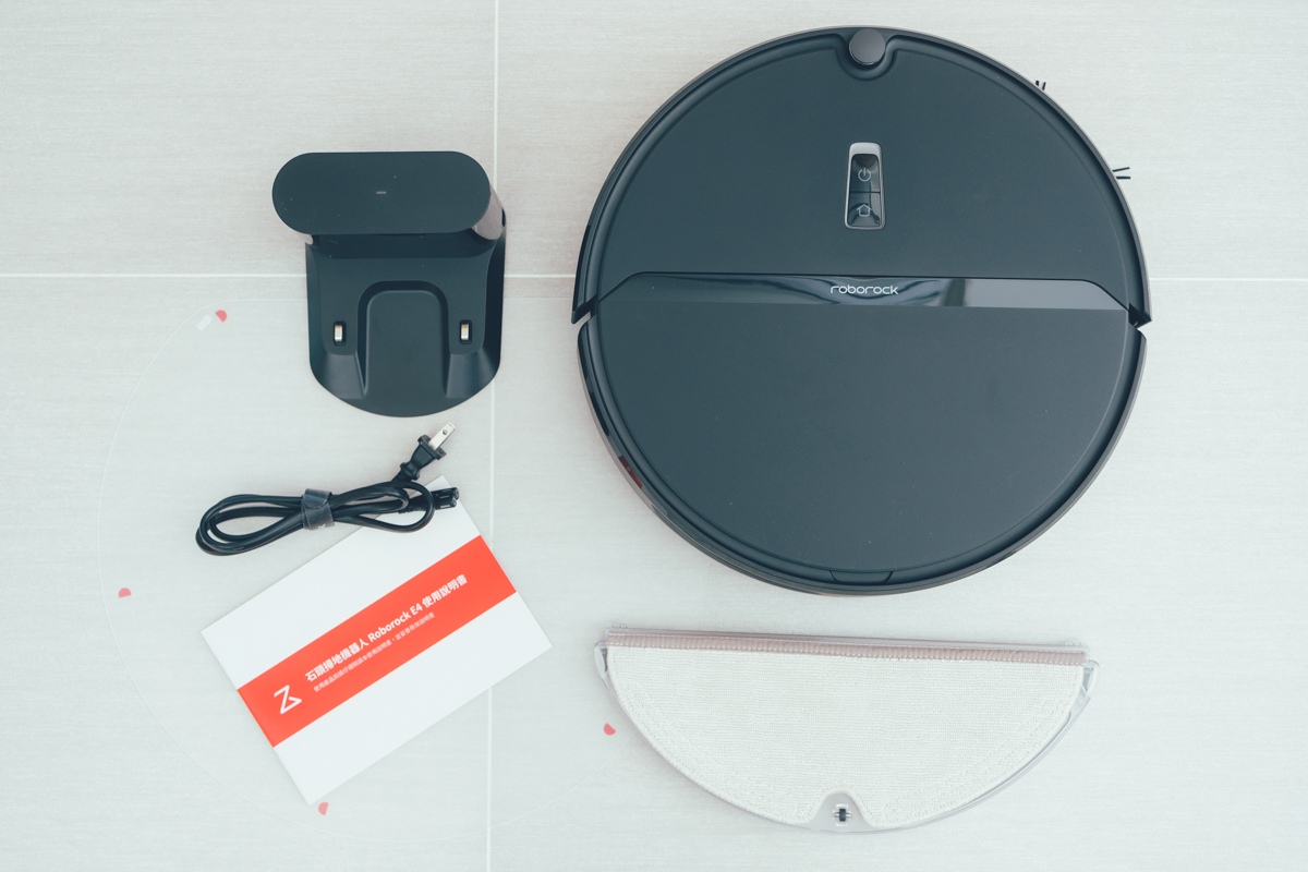 Roborock E4 標配包括有充電底座、電源線、掃地機防潮墊、使用說明書、拖布支架及拖布。
