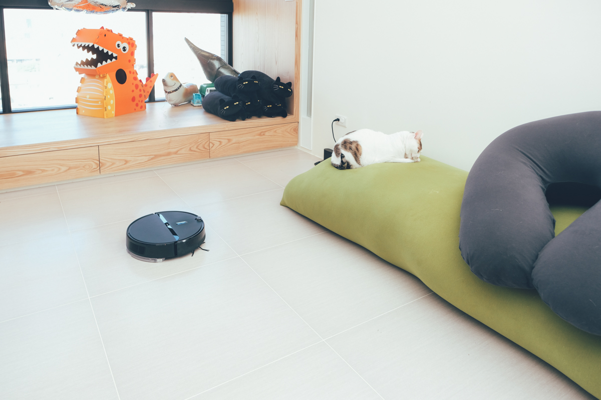 平常我家的喵星人聽到掃地機啟用都會光速跑走,躲到不見貓影,所以我這次特別用了輕柔模式來試看看,可以看到我家的大大一點都不在意的繼續清理他的毛,應該就知道差異了吧。