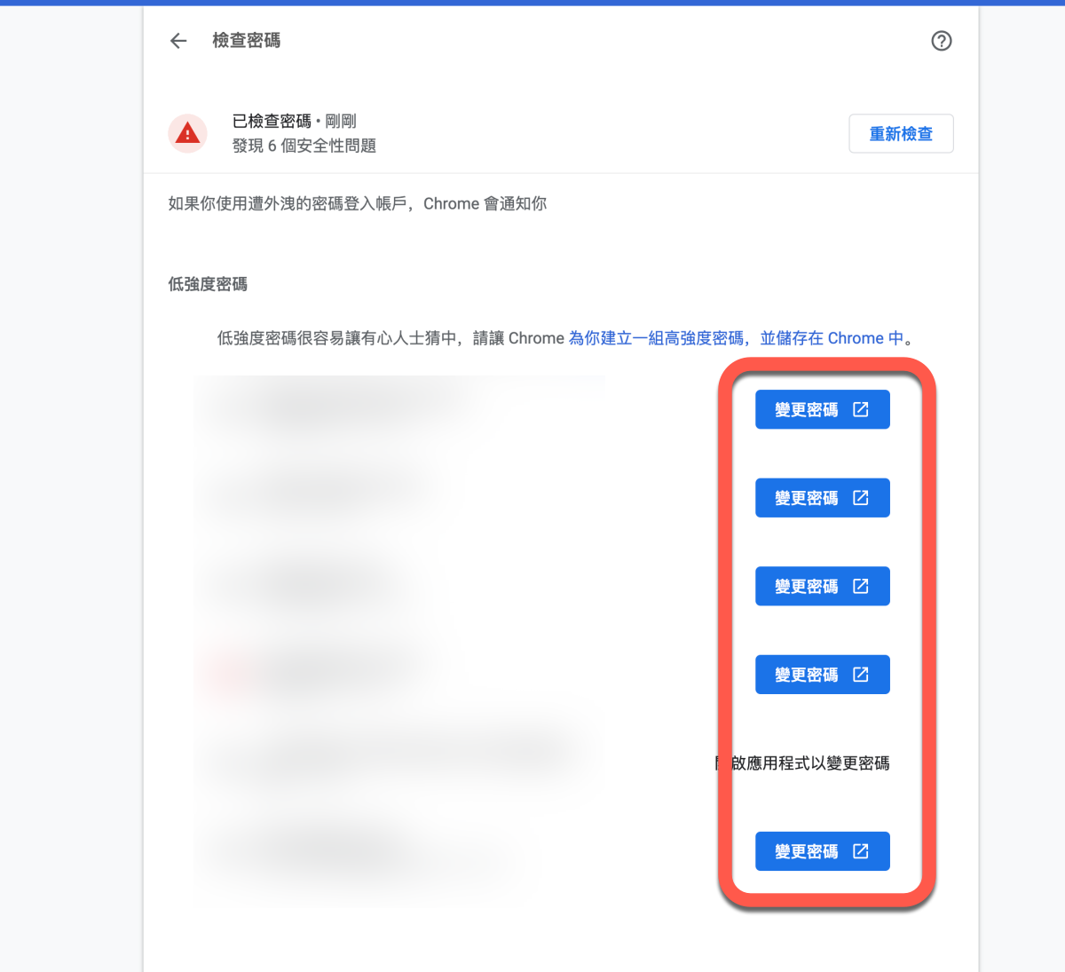 這邊就會告知你有哪些密碼是有安全性問題,也會提供你該網站的連結,點擊後方的「變更密碼」,就會前往該網站,你可以登入變更密碼後再重新登入該網站,然後更新保存的密碼即可,密碼如果自己記不住,就讓 Chrome 幫你建立一組高強度密碼也是不錯的選擇,反正直接保存起來吧。
