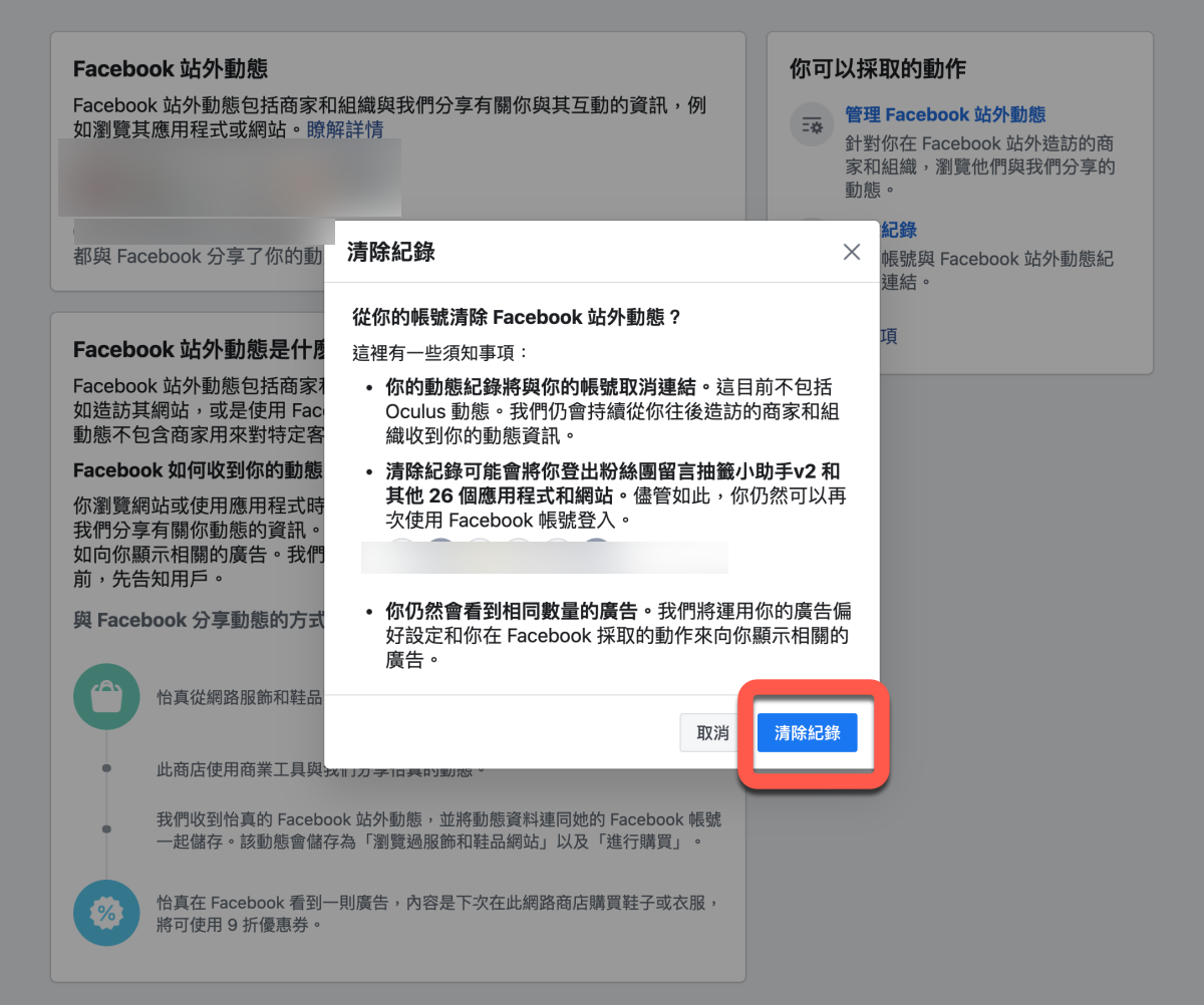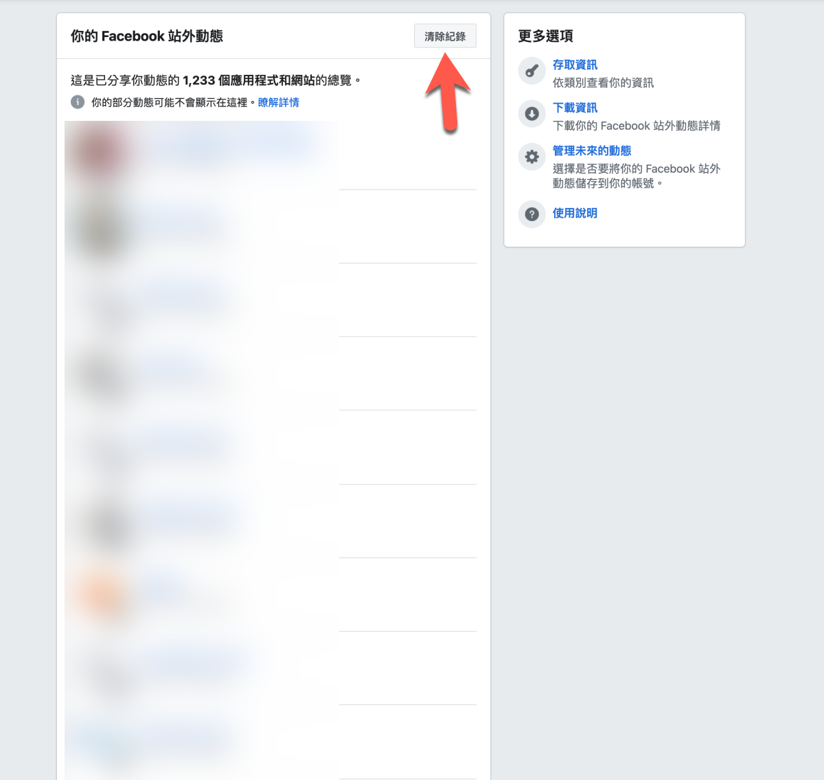 進入 Facebook 站外動態設定頁面,直接點擊右上角的「管理 Facebook 站外動態」。