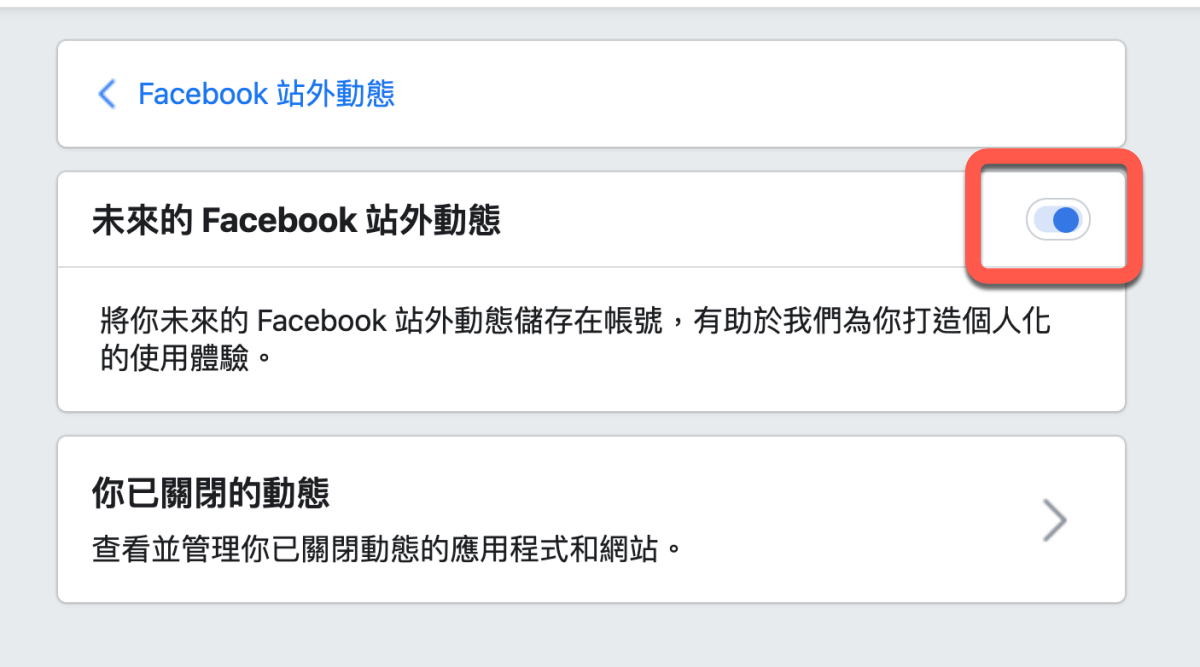 大家應該在 Facebook 上都有一樣的狀況,當你去逛了某個網站的東西後,回到 Facebook 會滿滿都是相關的產品廣告洗的你不要不要的,或者去玩了什麼遊戲回來,就一堆相關遊戲的廣告之類,其實跟你去 Google 搜尋內容是差不多的概念,基本上他們都會精準的抓到你的內容,但以 Facebook 來說,只要我們關閉站外動態,就不會這樣照三餐推薦你相關廣告,如果不想被追蹤內容,可以照以下方法關閉。