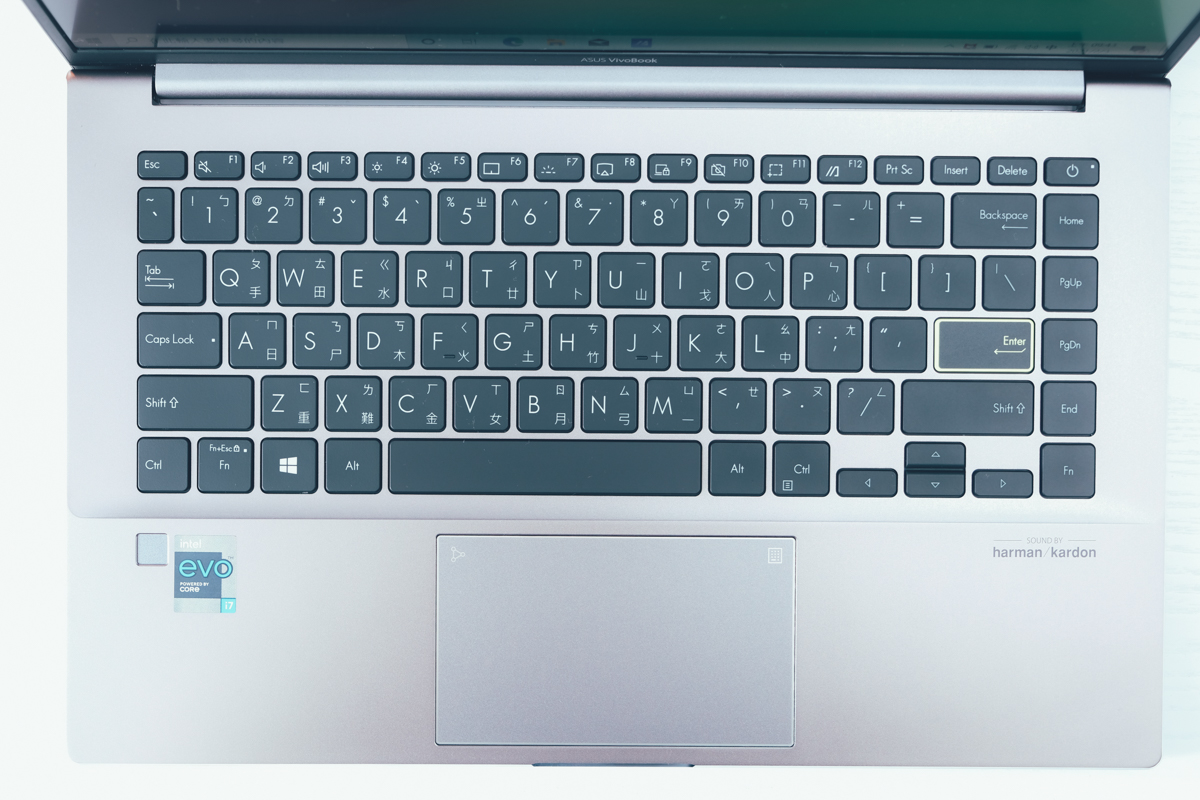 採用全尺寸背光鍵盤,鍵程為 1.4mm,是 14 吋筆電最常見的鍵程距離,而在 ASUS 的按鍵設計上,現在也多了可以自由切換 Fn 按鍵的使用,該我們在使用快速鍵時更加方便(就是可以選擇要不要按住 Fn 再去按 F 功能鍵)。