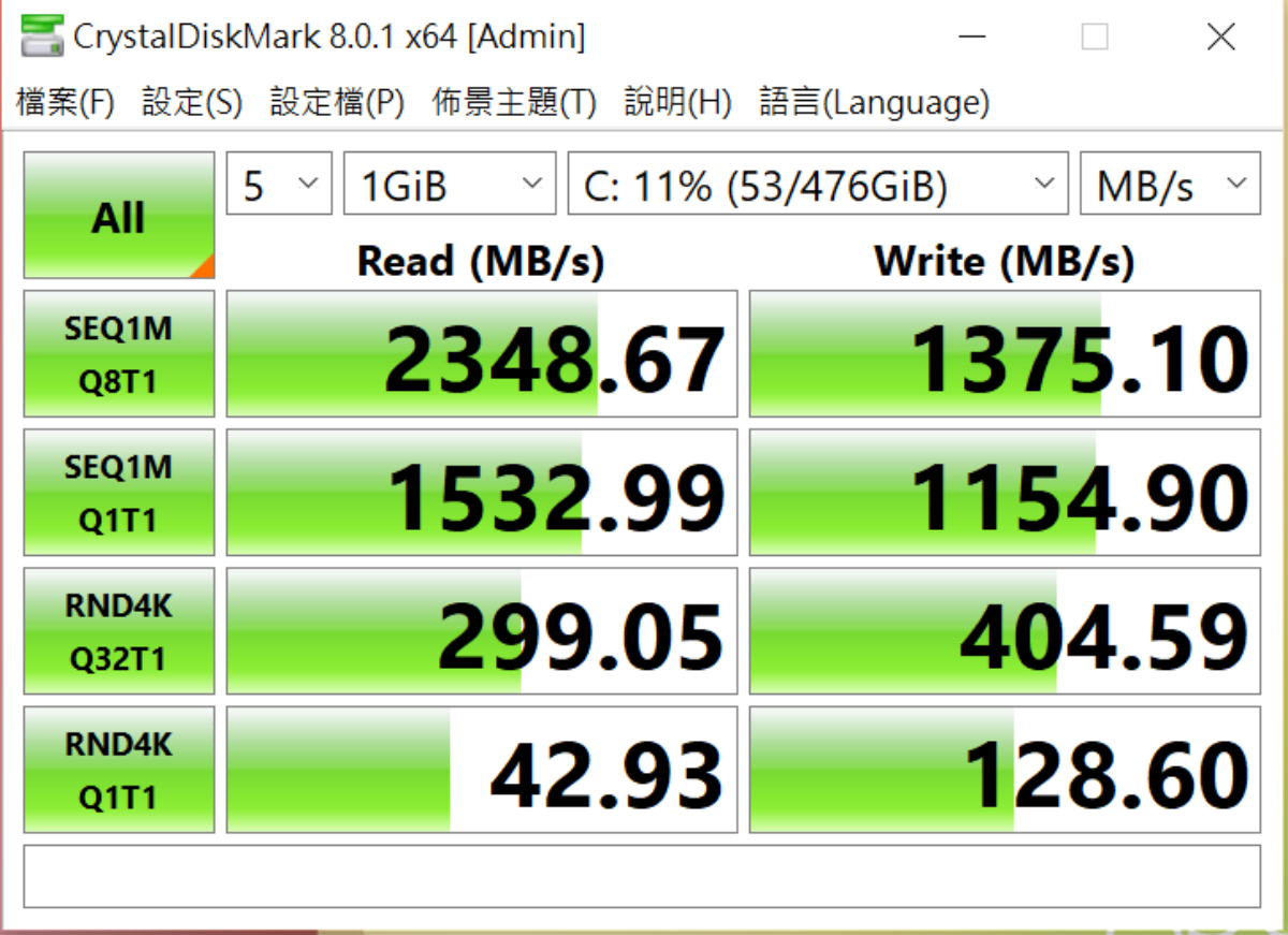最後來看一下透過 CrystalDiskMark 針對 SSD 的部份進行測試,讀寫分別為 2,348MB/s 以及 1,375MB/s。