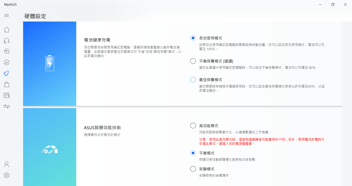 常態使用下,也可以注意一下電池健康充電以及 ASUS 智慧效能技術這二個設定,一般是建議可以選長效或平衡保養,但如果你是比較常在家中使用的話,可以選擇最佳保養模式,也就是電力主要充至 60% 就好,有要出門再選擇長效或平衡。