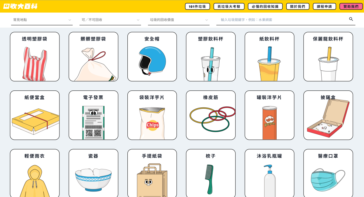 我們先來看一下這 101 件垃圾,這些都是我們相當常見的垃圾,大家都能清楚的分出哪些可以回收,哪些是一般垃圾嗎?不知道的話就點進去吧。