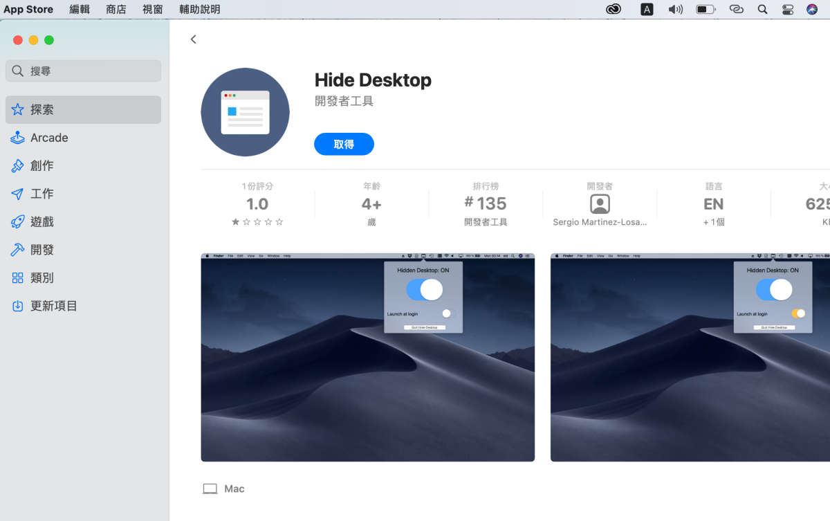 阿湯就不附上連結了,直接在 MAC APP Store 裡搜尋「Hide Desktop」就可以找到,直接安裝就可以了。