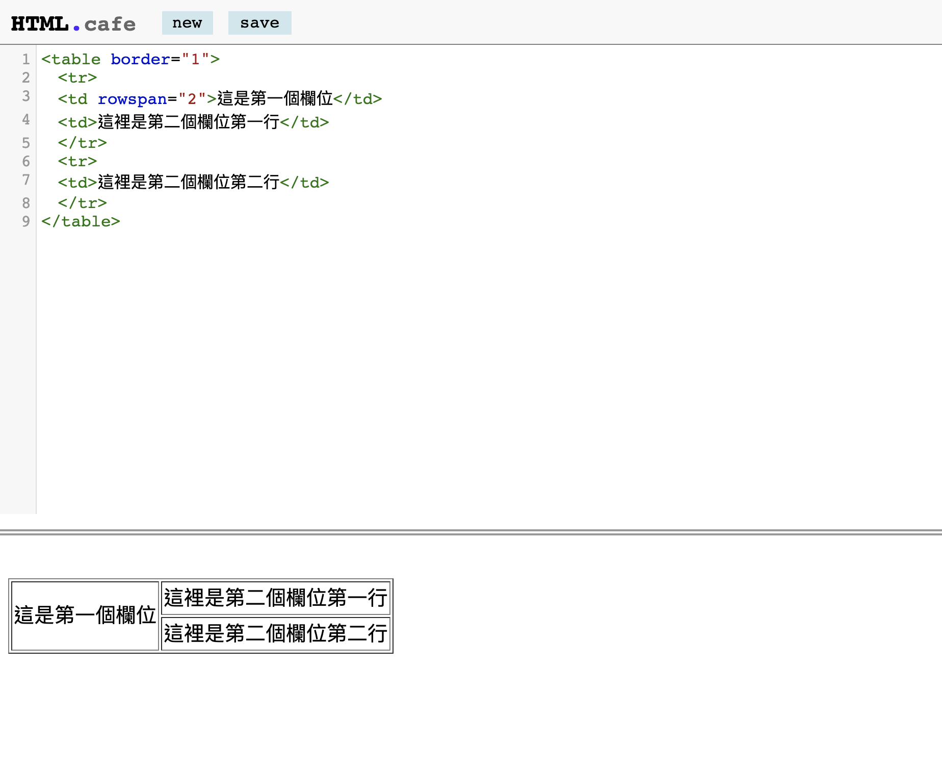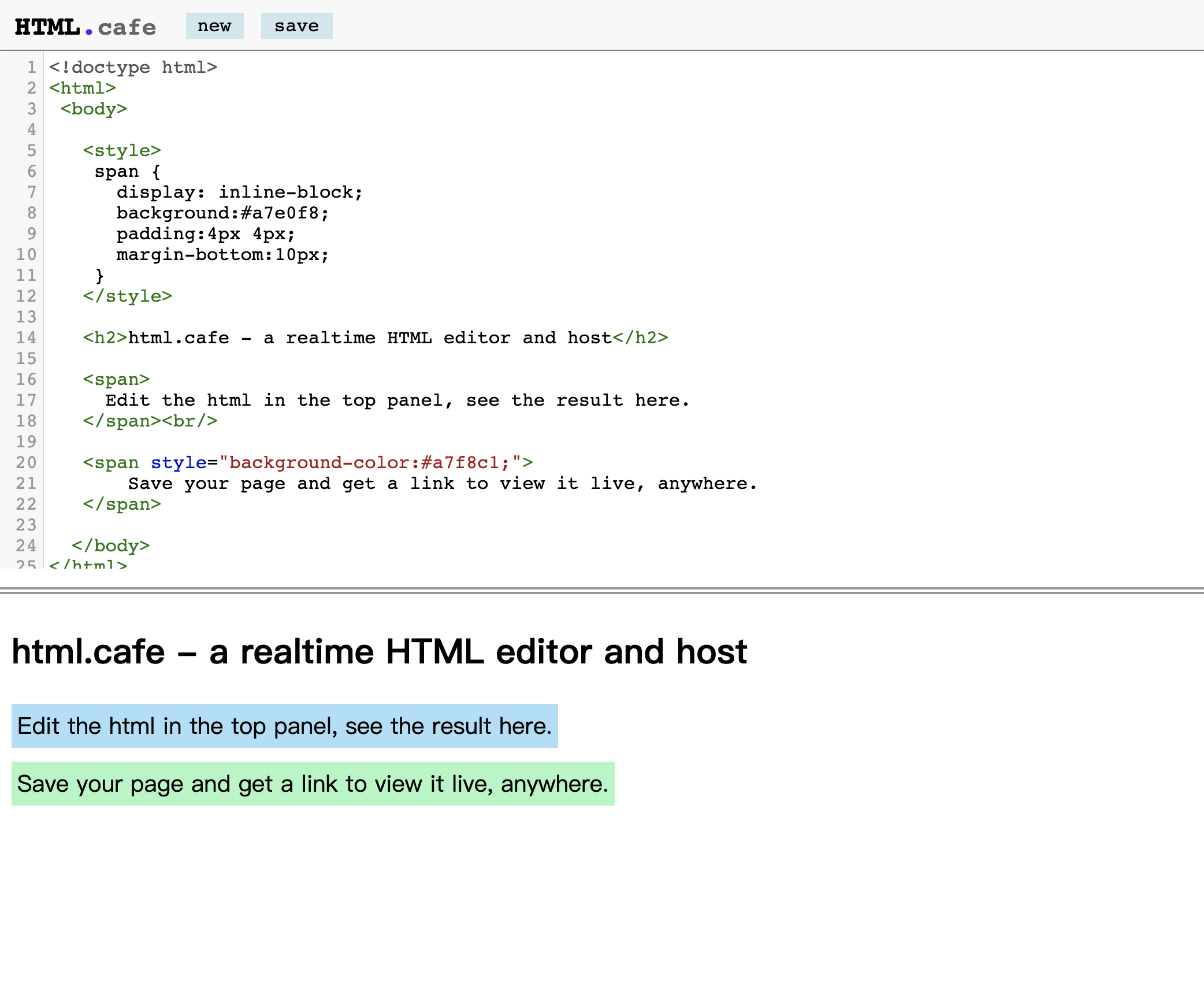 網站:https://html.cafe/進入網頁後就像這樣,你可以按 new 開放的或是儲存後可以產生臨時網址。