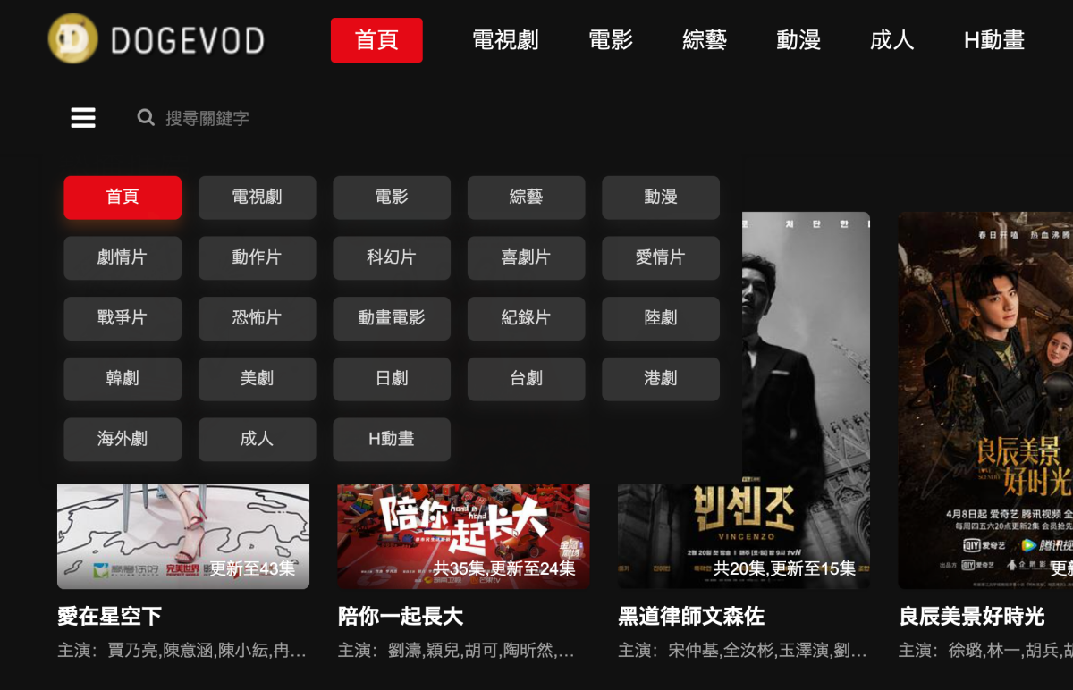 網站:https://dogevod.com/進入網站後,上 方就會有各主要類別可以點選,最後面的成人跟 H 動畫是導到別的網站去,並不是由他們提供的服務,這部份再自行注意一下。