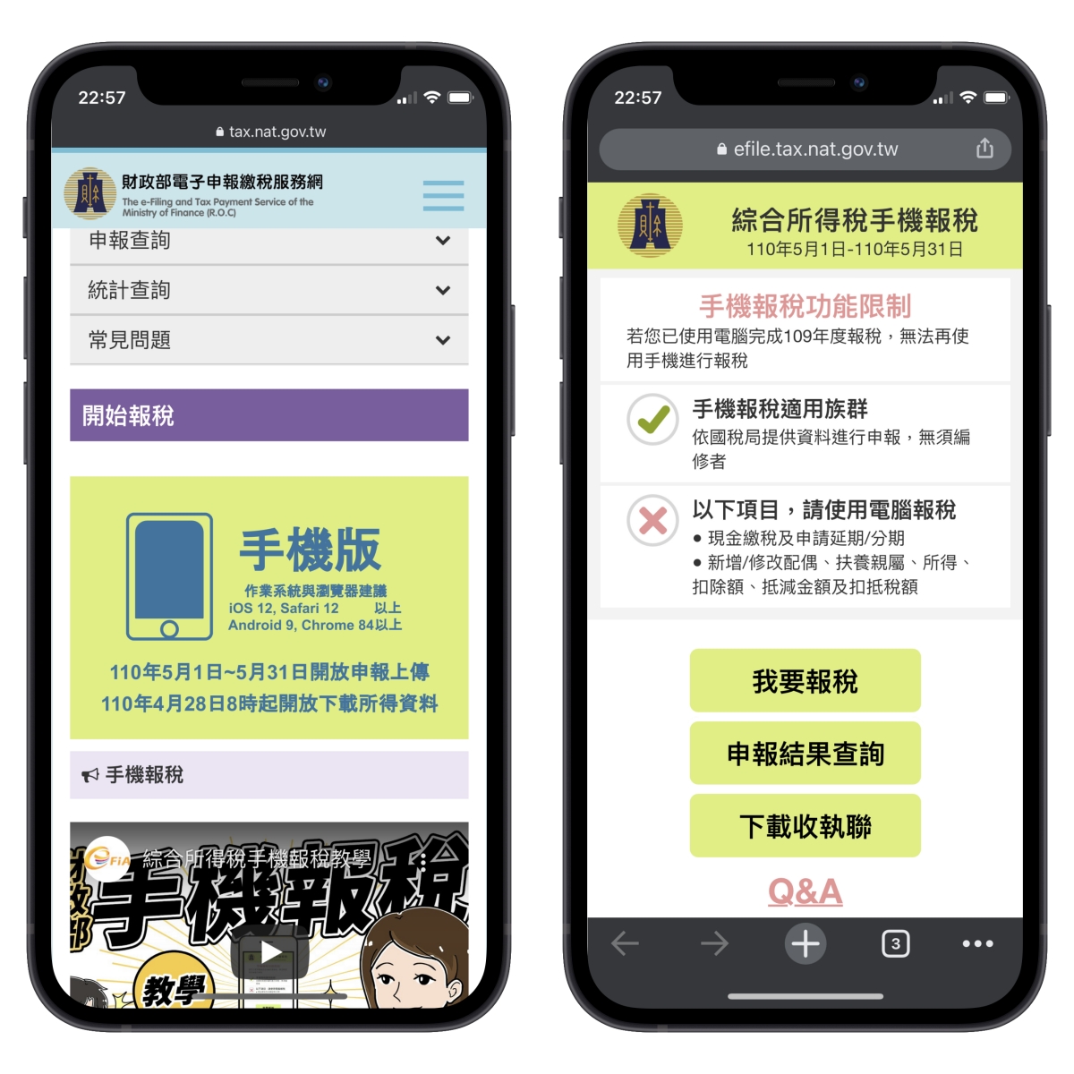 網站:https://efile.tax.nat.gov.tw/irxw/index.jsp用手機開啟財政部的繳稅服務網後,在首頁就可以找到「手機版」的報稅連結,進入後再點擊「我要報稅」就可以開始了。