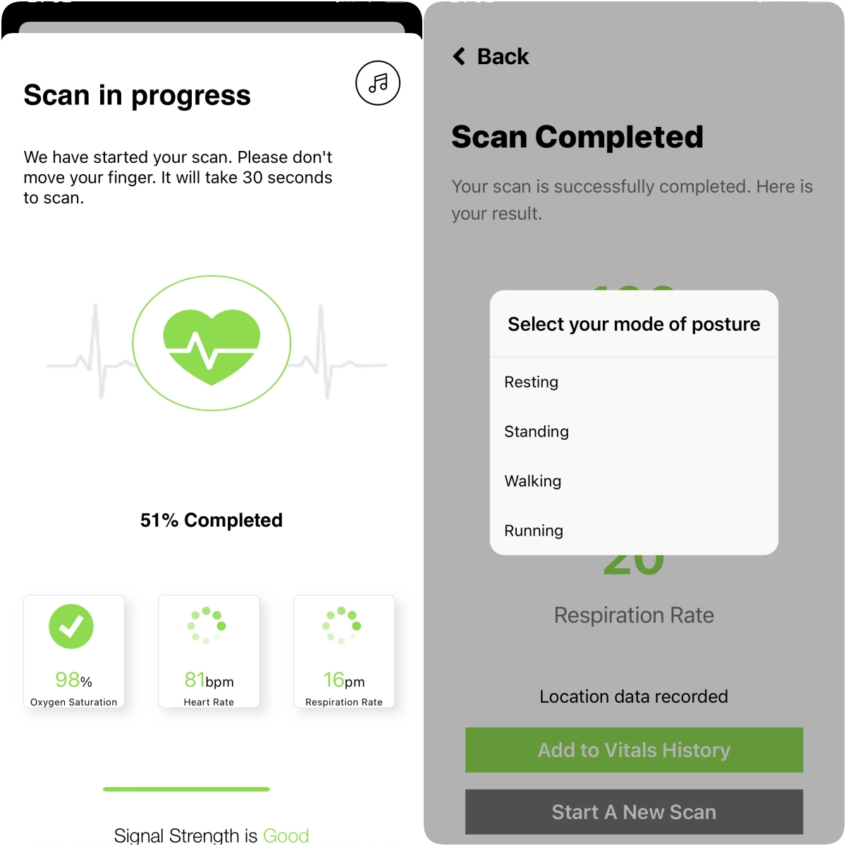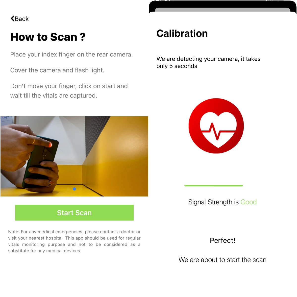 再來將你的手指頭放在主相機上,要整個覆蓋,按下 Start Scan 後,會先偵測你手指放的 OK 嗎,如果 OK 的話才會往下進行測量。