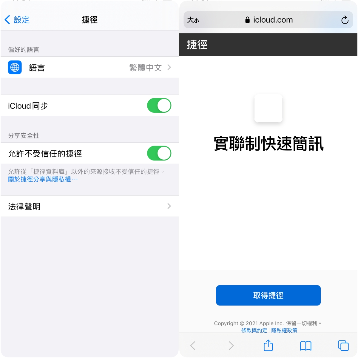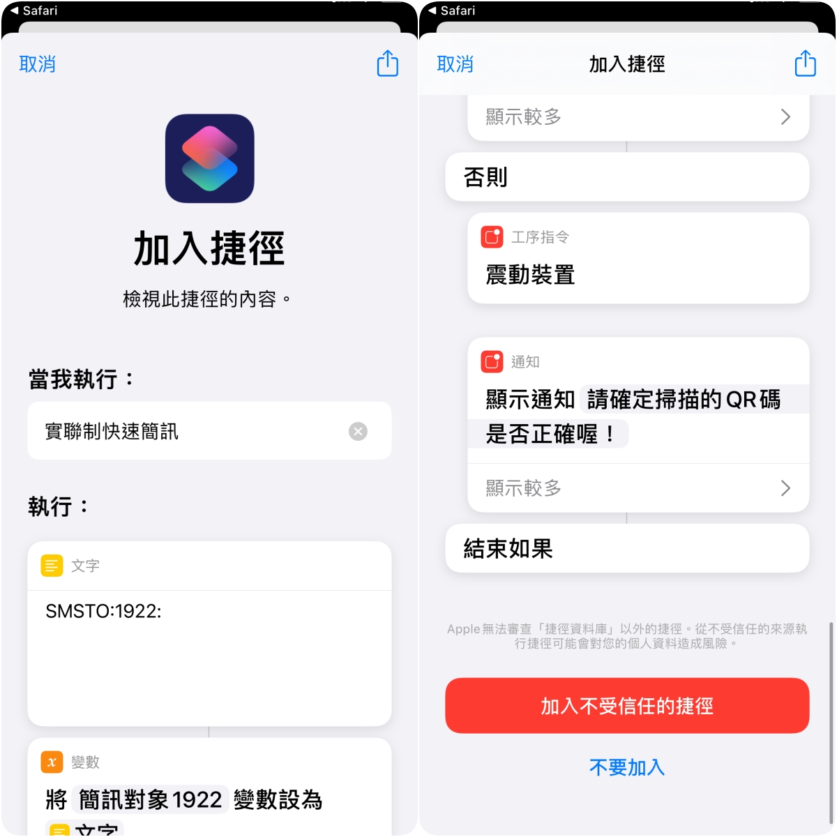 捷徑:請點我(請用 iPhone 開啟)在安裝這個捷徑之前,請先確認你的設定 > 捷徑,是否有將「允許不受信任的捷徑」打開,這樣就可以點擊上方的捷徑來加入了。