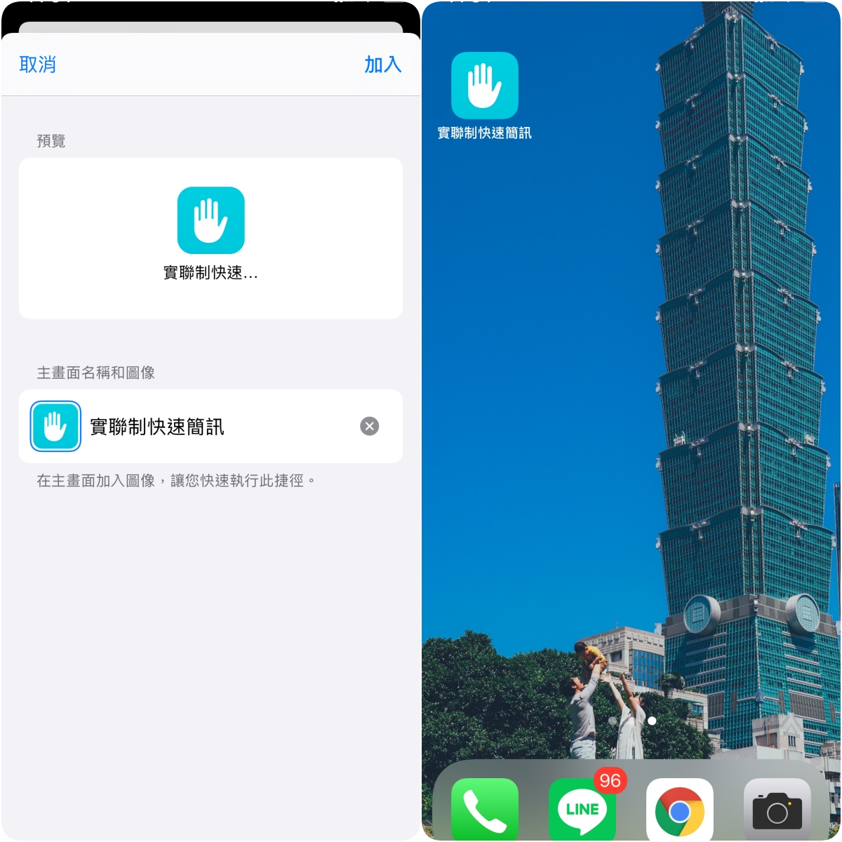 按下加入後,就會在你的手機主畫面上多這個捷徑按鈕了,以後想要掃實聯制簡訊 QR Code,手機對準 QR 後按下去,一秒就結束了。