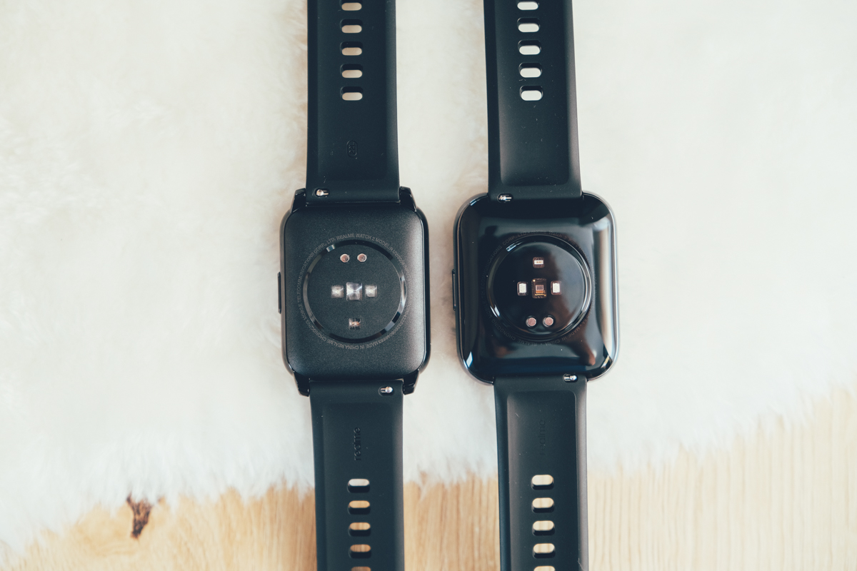 realme Watch 2(左)及 realme Watch 2 Pro(右),在背面的設計看似有點不同,不過功能都是一樣的,同樣都支援磁吸充電、心率及血氧濃度的偵測。