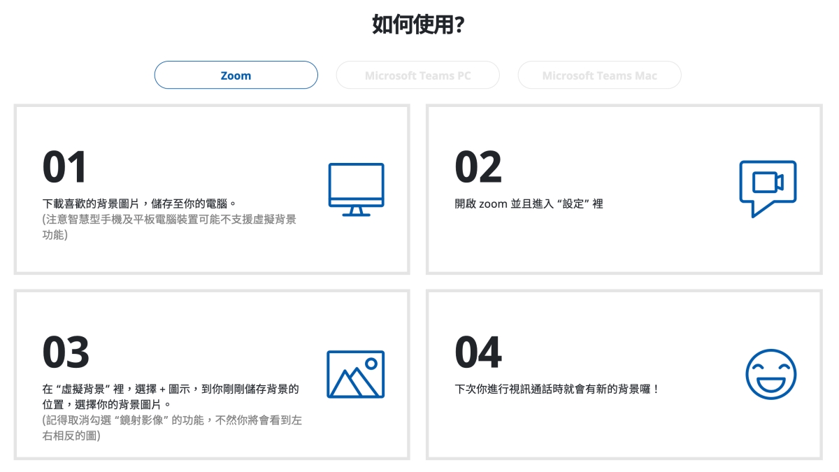 再往下一點也提供了 Zoom 及 Microsoft Teams 的替換教學,相當的貼心,大家快去下載來置換吧。