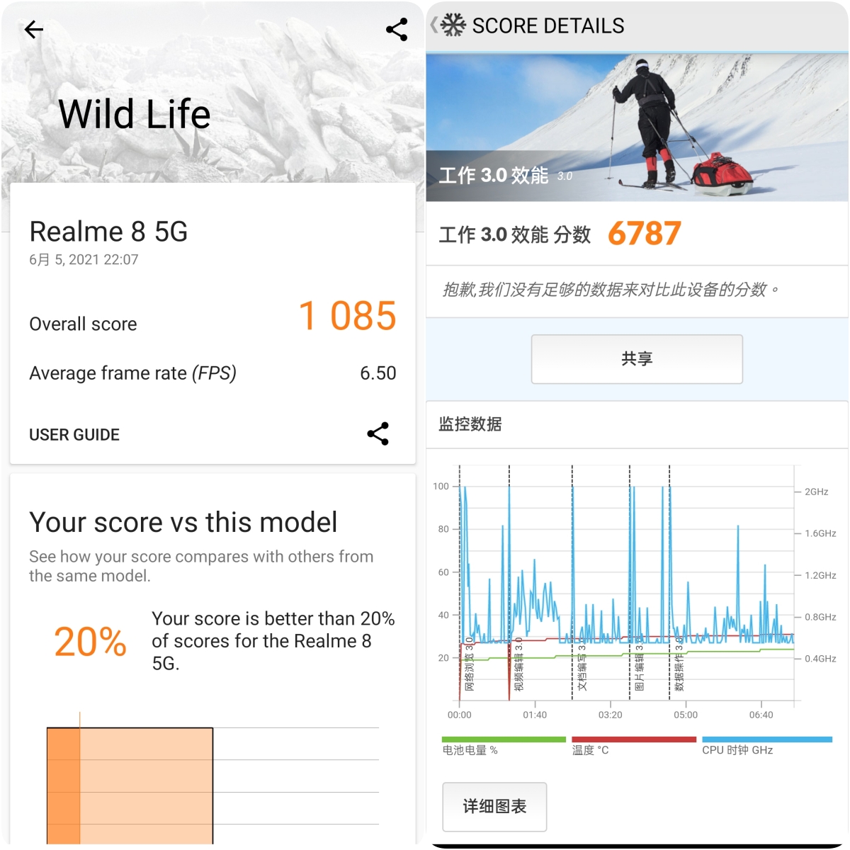 3D Mark 透過 Wild Life 測試下獲得 1,085,而 PC Mark 工作 3.0 效能獲得 6,787。