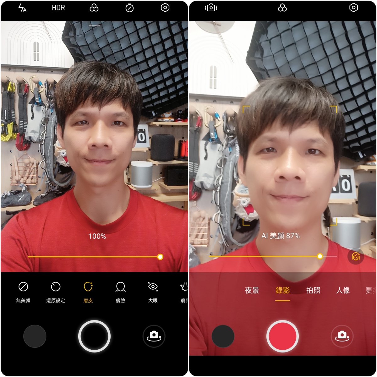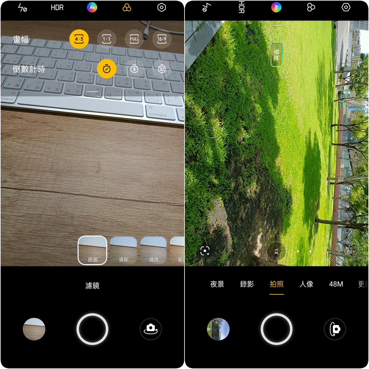 其它像是裁切比例、倒數計時、濾鏡、HDR 以及 AI 場景場強功能,這項功能會自動判斷場景給予適當的調整,讓照片看起來更加厲害。