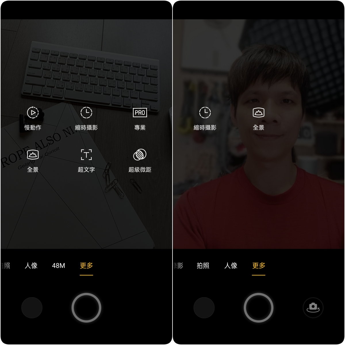 其它相機功能包括慢動作、縮時攝影、專業、全景、文字以及超級微距(主鏡頭),前置鏡頭的額外功能為縮時、全景。