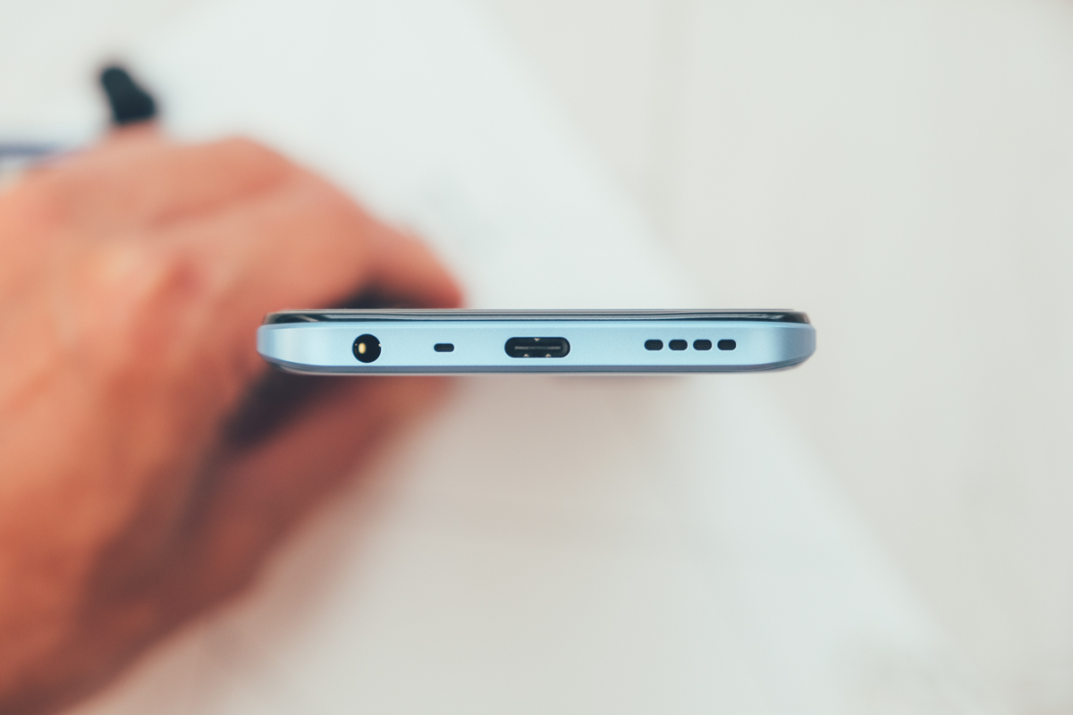 下方包括 3.5mm 耳麥孔、揚聲器以及 USB-C 充電連接埠。