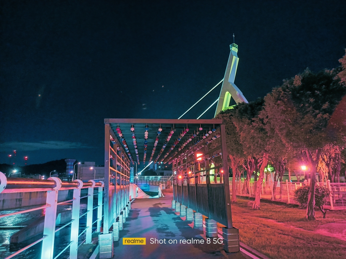 夜間拍照的部份,除了透過夜景模式拍攝可以讓畫面更加銳利之外,這次 realme 8 5G 上也加入了夜景濾鏡,透過這些濾鏡的套用,可以讓夜景看起來更加璀璨奪目。