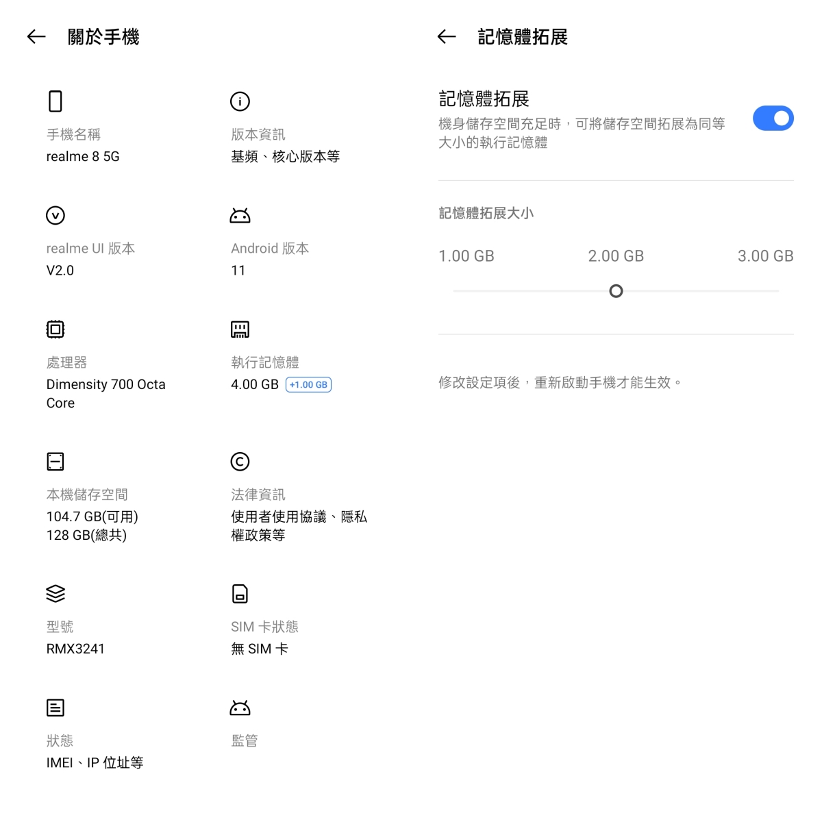 在 realme 8 5G 手機上加入了 DRE(Dynamic RAM Expansion)動態記憶體擴展技術,可以在設定 > 關於手機 > 進入「執行記憶體」,找到記憶體拓展,在 4GB 記憶體版本的 realme 8 5G 上分別可以選擇設定 1GB/2GB/3GB,如果是在 8GB 記憶體版本上分別可以設定 2GB/3GB/5GB,其實只要看一下上面的說明就知道 DRE 的作用,「機身儲存空間充足時,可將儲存空間拓展為同等大小的執行記憶體」,也就是將你用不到的儲存空間挪為記憶體來使用,假設原本只有 4GB 記憶體,只要開啟了 DRE 技術設定為 3GB,那麼就等同有 7GB 的記憶體可以使用,特別是在手機多工程序較多時更可以感受到有沒有開啟 DRE 的差別。