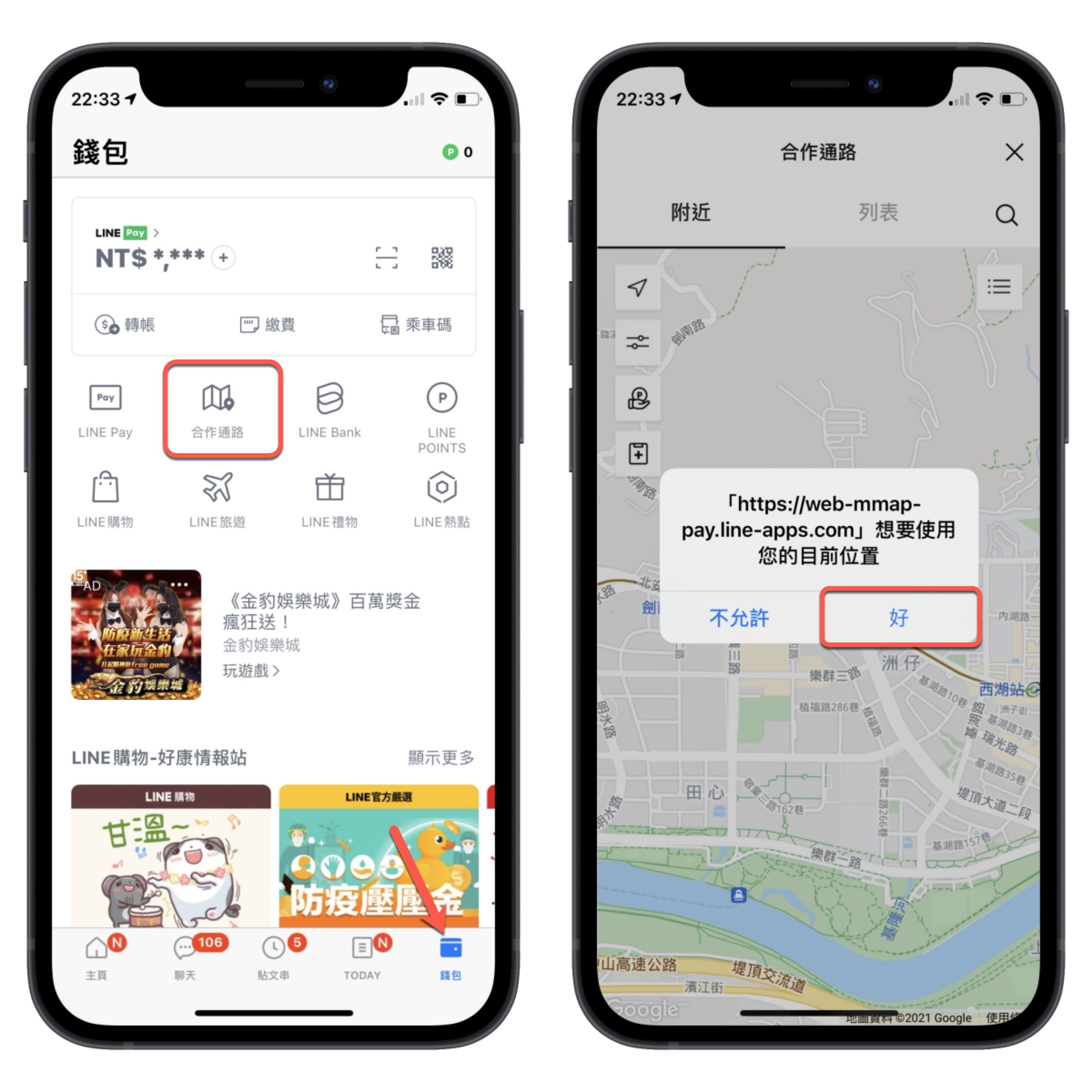 首先打開你的 LINE,進入右下角的錢包後,點擊「合作通路」,然後允許使用你目前的位置,就可以定位查詢鄰近的資訊。