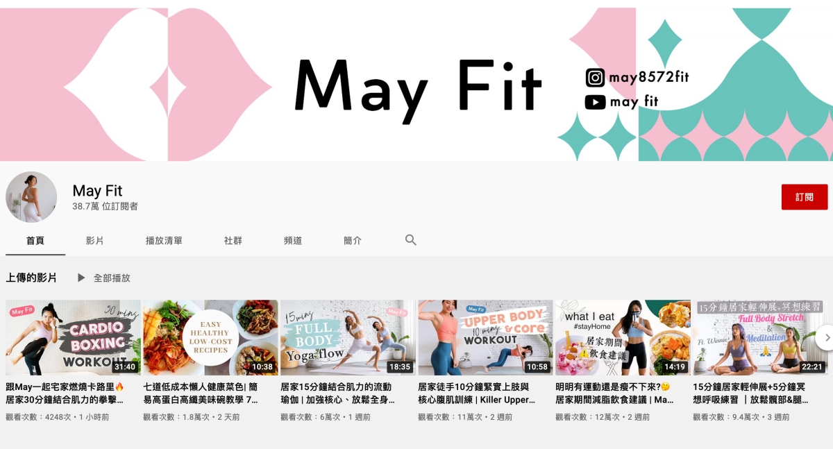 May Fit 我想在台灣的健身界大概都知道的人物,在女生裡面算是相當厲害的健身名人,分享了非常多居家徒手的健身方式,親和力很強,看影片跟著做時會很有陪伴感,如果你沒有任何運動基礎的話,可以慢慢試看看,因為她也會一直給你鼓勵,讓你有維持下去的動力。