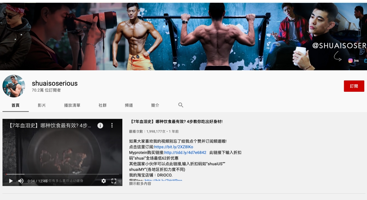 shuaisoserious,在 LA 的中國人,具有教練資格證,每年也都會參加健美比賽,雖然已經相當專業,但還是請更專業的教練持續精進,其內容相當專業、剪輯質感很好,說明也很清楚,重點是身材好、長的帥,我想女生們跟著做絕對不會偷懶吧。