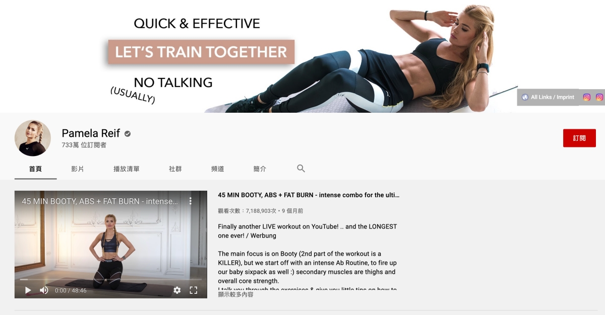 Pamela Reif,長的很漂亮,影片內不講話,很適合不喜歡聽廢話的人跟著訓練,內容大多為有氧高強度訓練,運動方式或訓練部位很廣泛,讓你訓練絕對不會無聊。