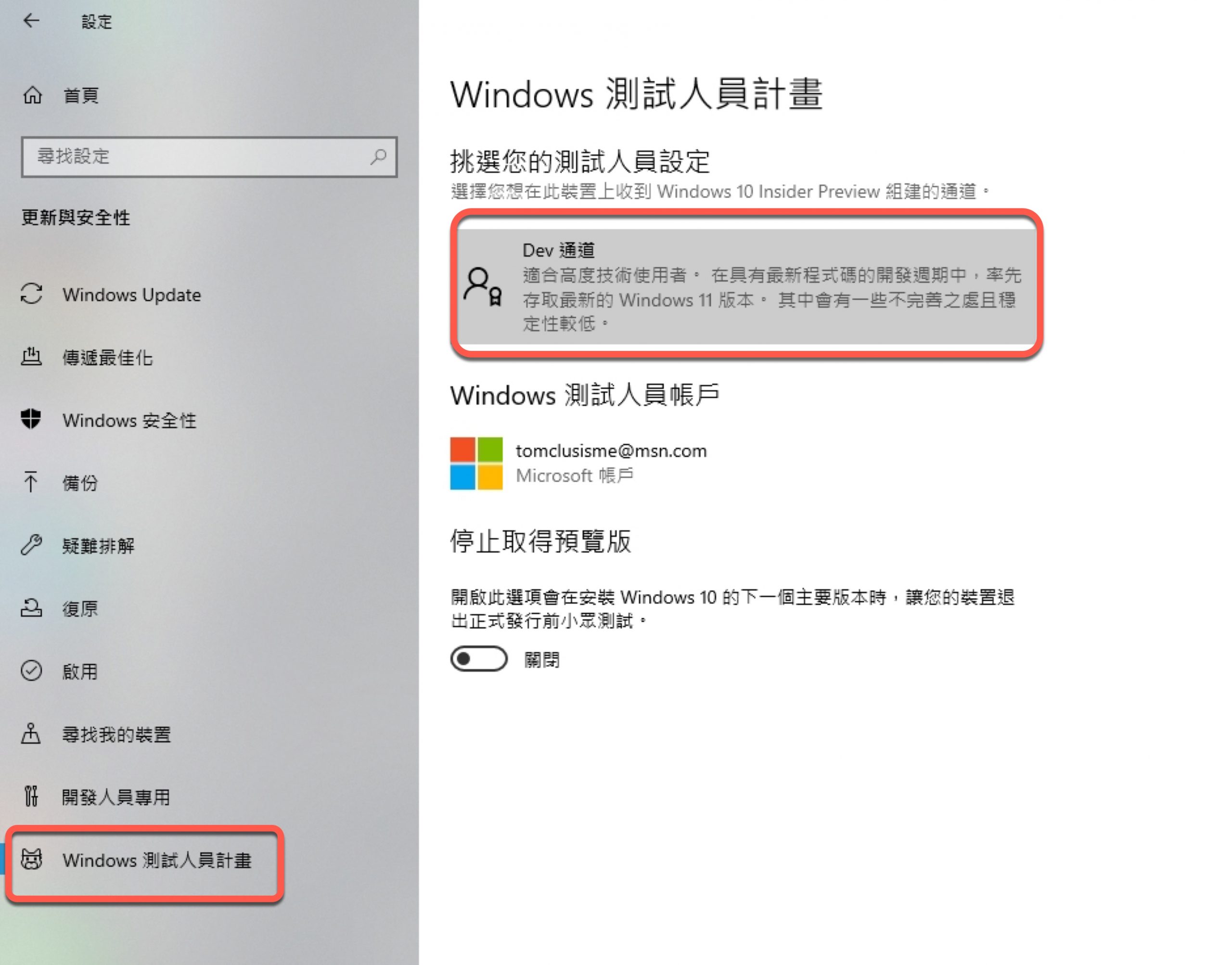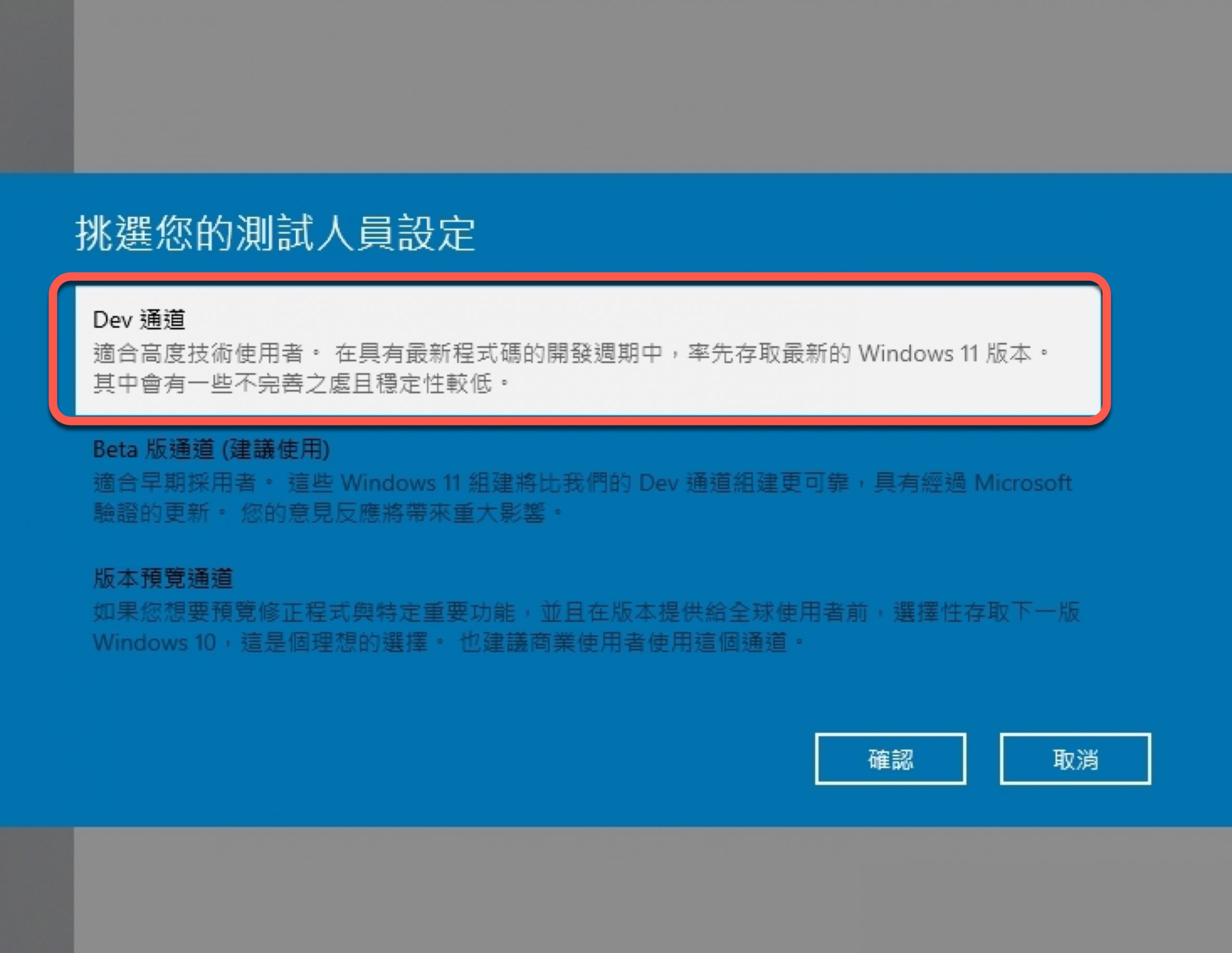 重開機後再回到 Windows 測試人員計畫這一頁,就會看到「Dev 通道」,這代表你的電腦是可以升級到 Windows 11 且可以更新 Windows 11 的預覽版。