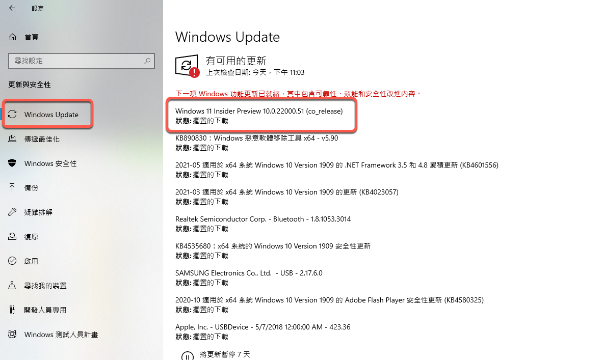 如果你可以更新預覽版的話,這時前往 Windows Update 按下檢查更新,就會看到有 Windows 11 Insider Preview 可以下載囉,想嘗鮮就去試試吧。