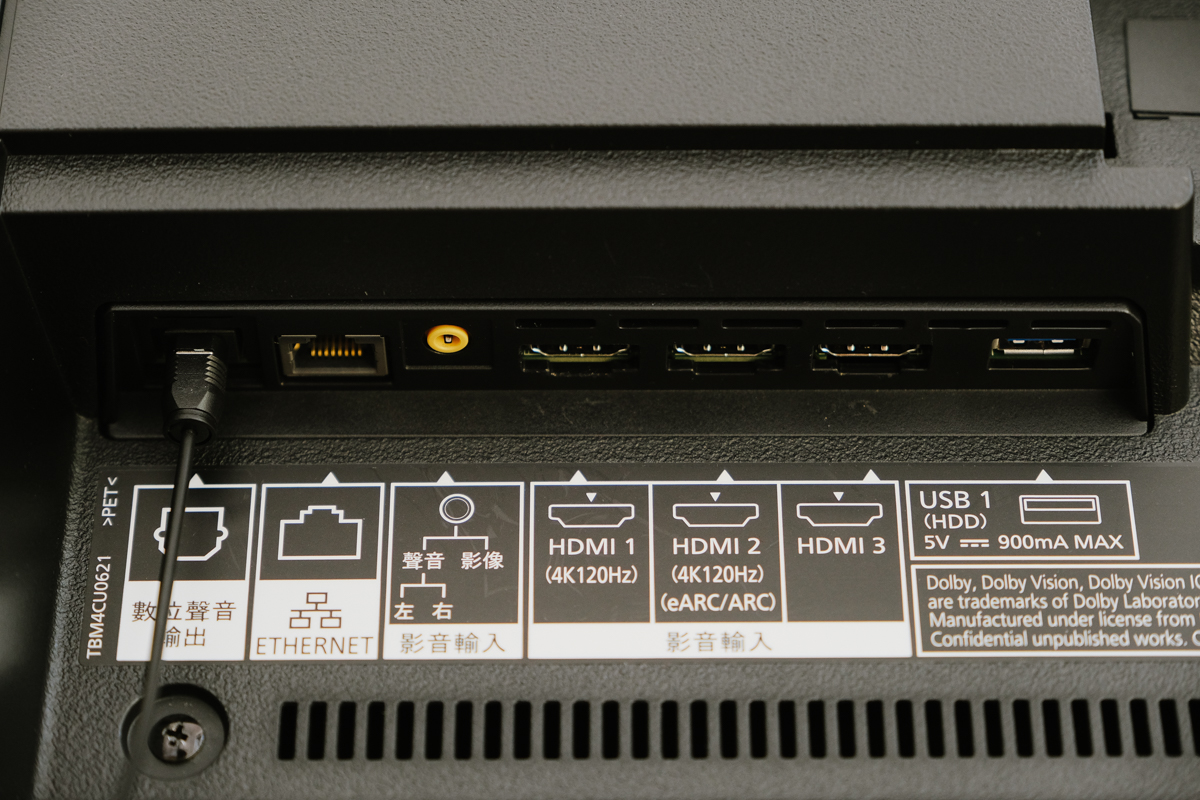 下方包括數位光纖連接埠、乙太網路連接埠、AV 端子、HDMI 共三組(其中 HDMI 1 及 2 支援 4K 120Hz,而 2 更是支援 eARC/ARC),另外最右還有一組 USB-A 支援到近 1A 的電流輸出,基本上符合很多小電流的 Android 電視棒使用,就不需要額外再接電源。