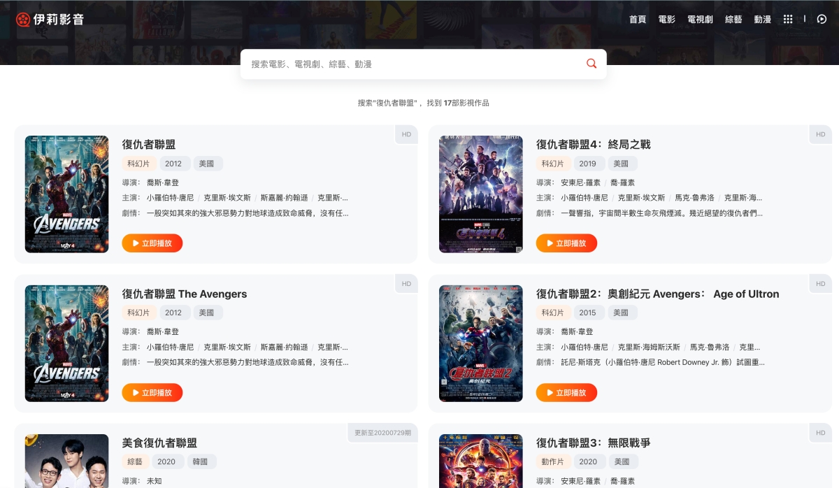 比如搜尋復仇者聯盟,沒想到全集都有.. 不愧是從大陸來的內容,超強。