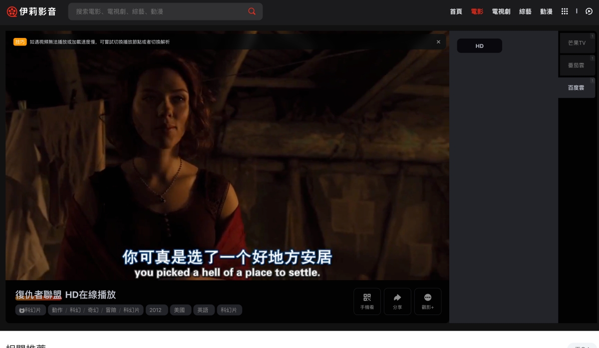 畫質寫 HD,不過實際觀看,畫質應該是比 HD 再略差一點點,不過是可以接受的程度,如果你覺得播放不夠順暢的話,最右邊還可以切換來源,像這部電影就有分芒果 TV、蕃茄雲跟百度雲。