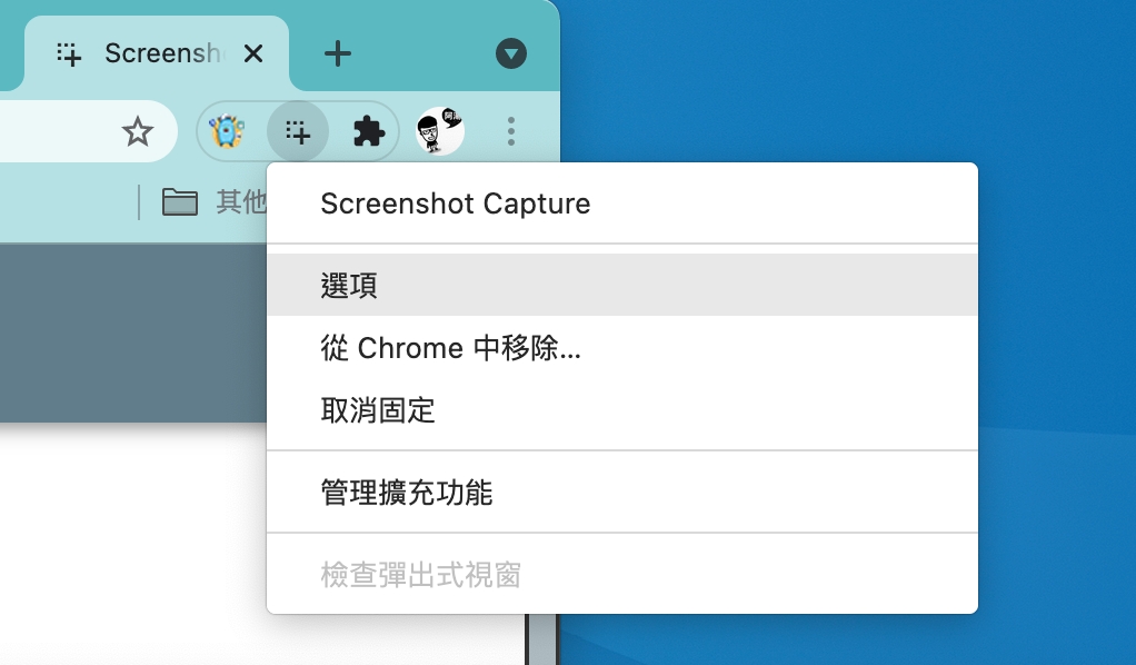 截圖的話只要按一下圖示,會出現藍色標記,就可以去選取要截圖的網頁範圍,如果想要再進行設定的話,可以右鍵進入選項。
