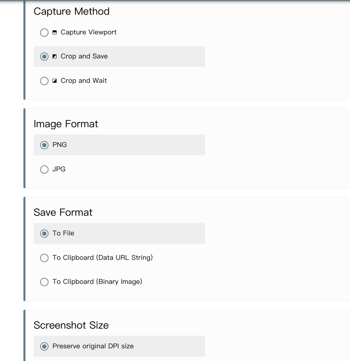 相關設定其實也沒有什麼好選擇,截圖的模式、圖片格式、儲存方式及路徑,就這樣,基本上都照預設就可以了,儲存的預設路徑會跟隨你的 Chrome 下載路徑,你設定在哪裡就是哪裡,非常簡易吧。