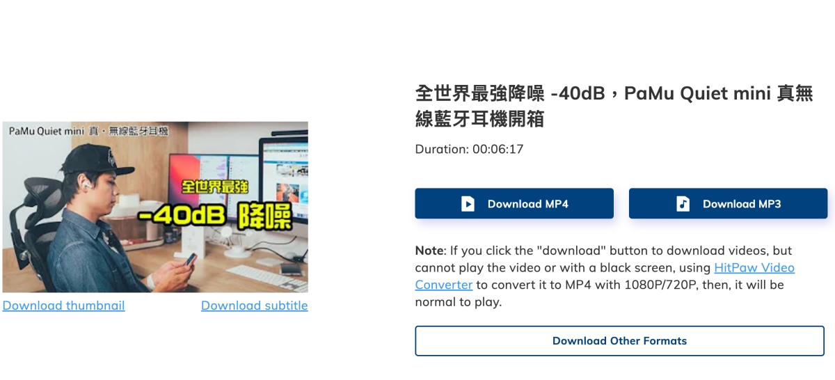 然後就會出現 Download MP4 及 MP3 可以選擇,以 YouTube 來說,還可以下載封面及字幕(如果有的話),不過有些影片格式可能會導致下載後無法播放,他上面有小提醒,可以下載 HitPaw Video Converter 來轉檔,就可以正常播放了。