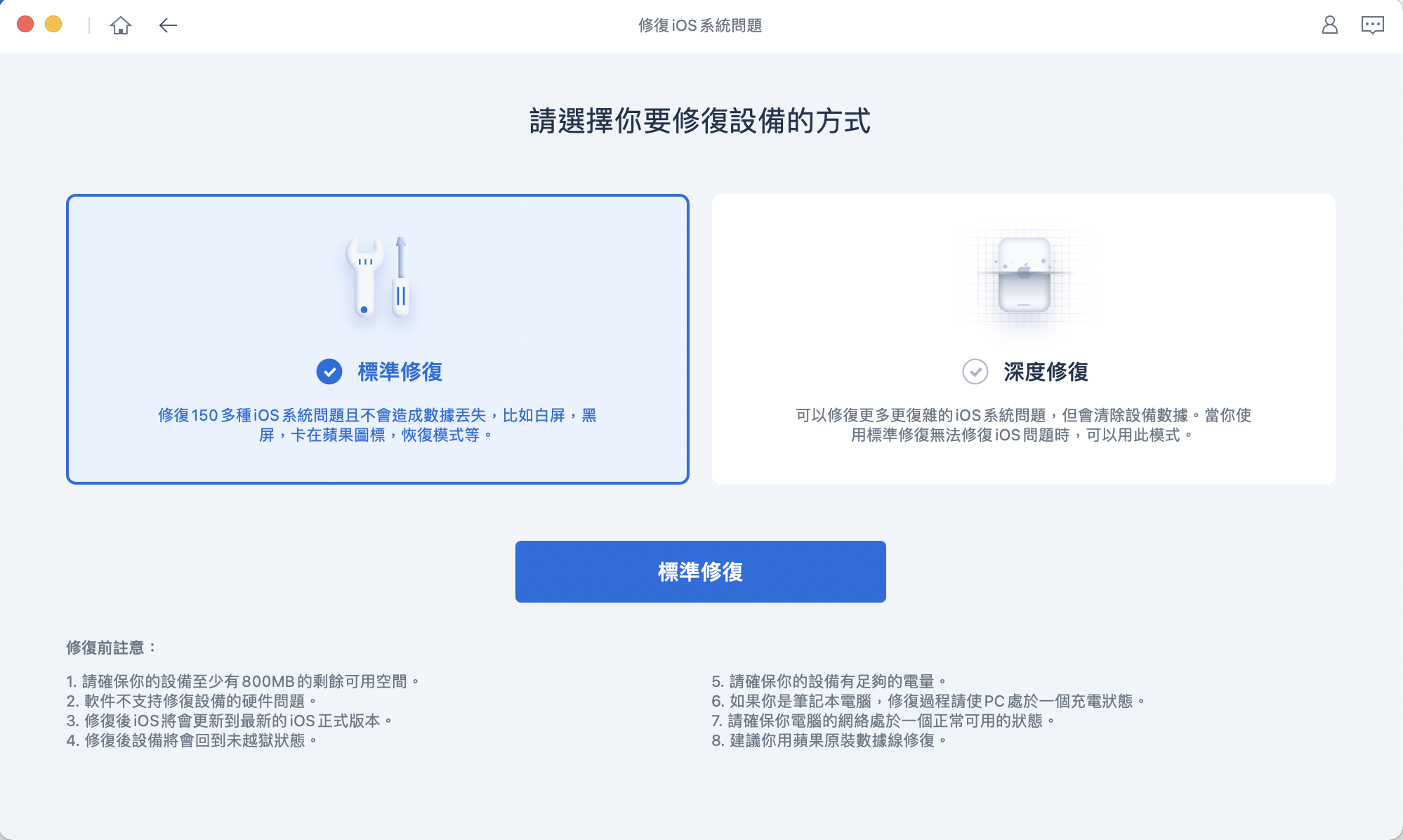 一般來說,會建議大家出現任何問題時,先使用「標準修復」試試,如果問題解決就不用再往下,如果沒有解決一定要用上深度修復的話,手機可以先備份就記得先做好,再開始進行深度修復哦。