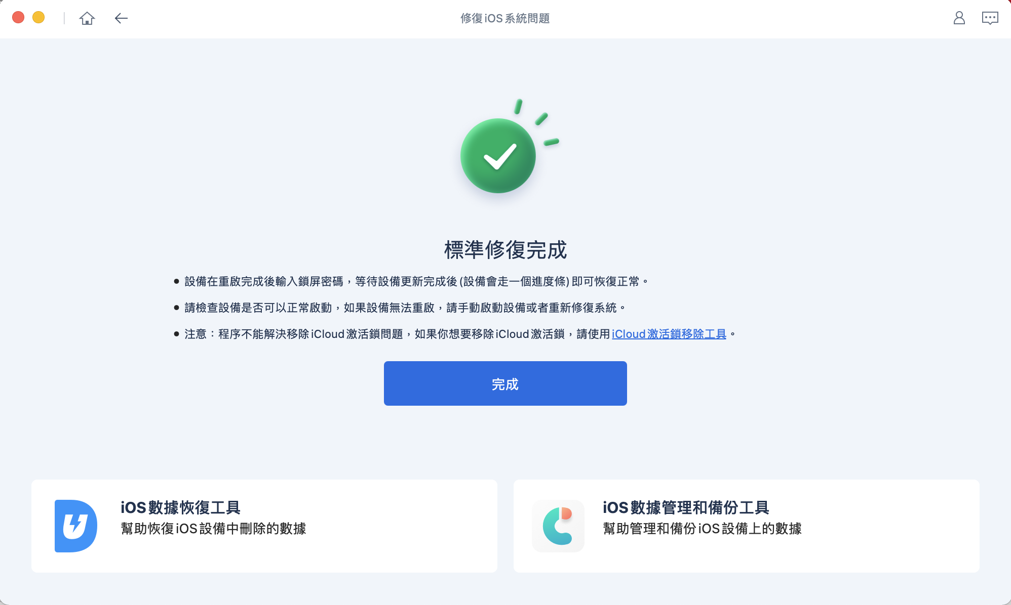 嗯~就這麼簡單的修復了,這時就去檢查看看你的 iPhone 是不是可以正常更新,或是原本的問題是否排除,不論是黑畫面、白蘋果、無法更新等,我想大多常見的問題都能解決,除非你真的是硬體的部份壞掉啦,那就只能直接送修了。
