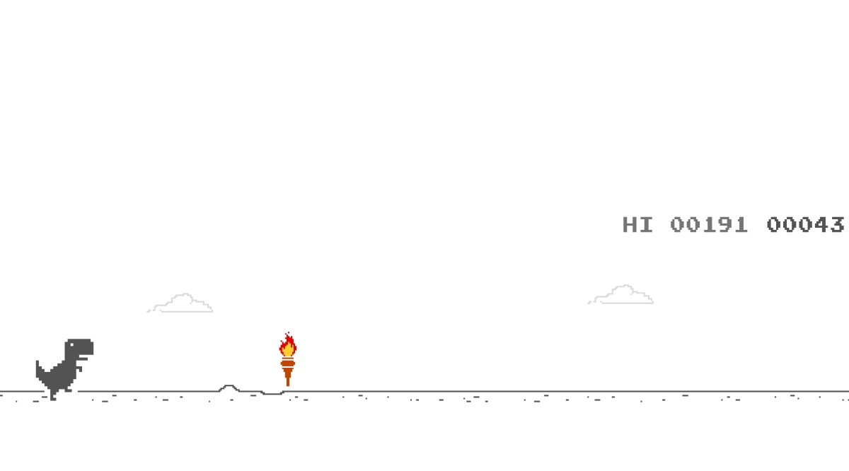 除了讓你的電腦離線後進到小恐龍遊戲外,也可以輸入網址「chrome://dino/」進入,原本的仙人掌外,會多了火炬的出現,請不要跳過火炬,直接撞上去就會出現東京奧運版了。