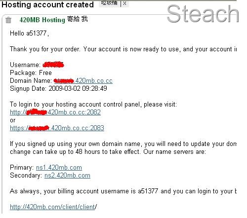 FTP就是你的域名:帳號.420mb.co.cc 登入帳號及密碼同一般帳戶 CP後台登入:即信上的帳號.420mb.co.cc:2082 如果要綁定網域,下面的ns1與ns2即為NS記錄SQL的開通及後台網域設定可參考以下文章