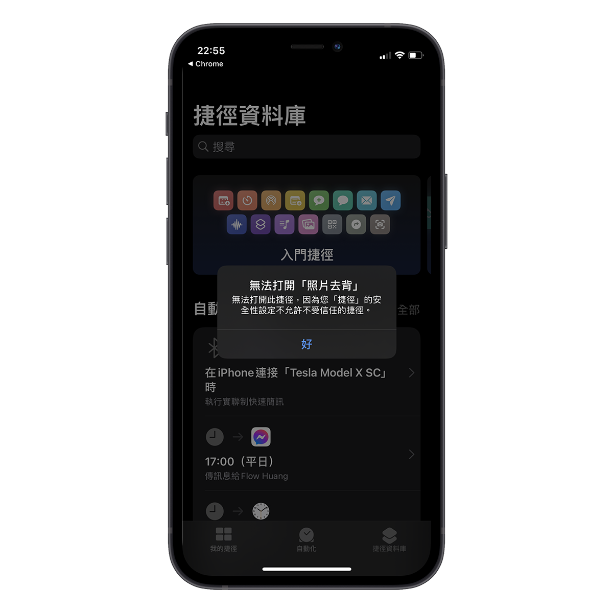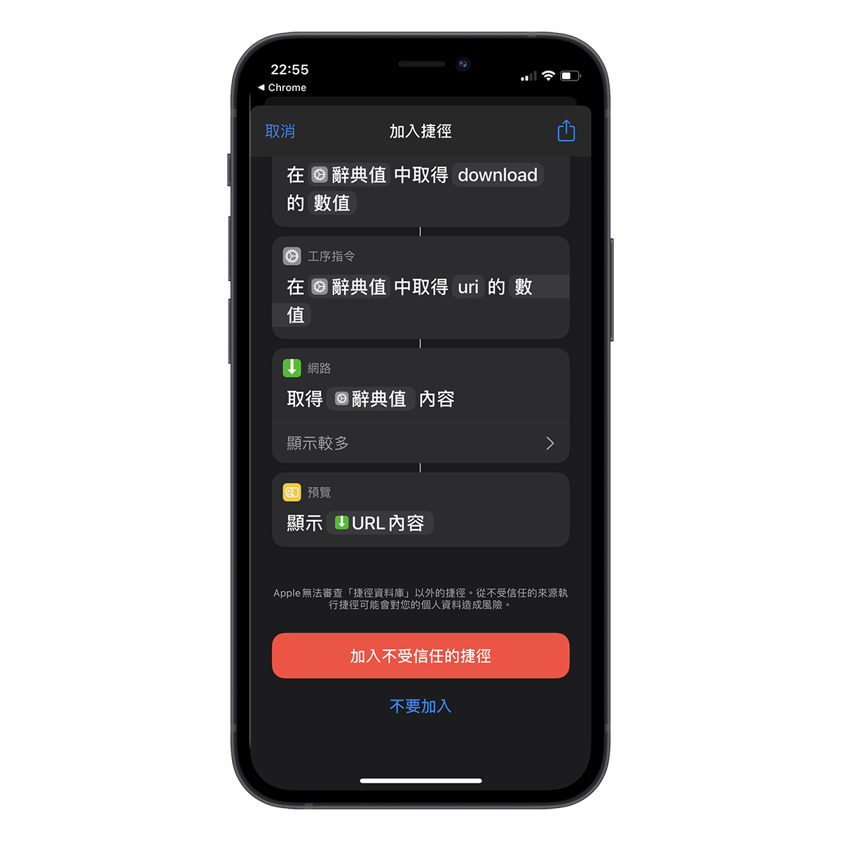 首頁 › 手機應用教學 › 安裝 iOS 捷徑時跳出「不允許不受信任的捷徑」怎麼辦? 安裝 iOS 捷徑時跳出「不允許不受信任的捷徑」怎麼辦? 發佈日期:2021/8/22 作者:阿湯 分類:手機應用教學 前陣子分享了不少實用的 iOS 捷徑,像是相片去背、查看電池循環次數、實聯制掃 QR 秒送簡訊等,都是非常好用的 iOS 捷徑,不過很多人在安裝這些第三方捷徑時,都會遇到一個小問題,出現「不允許不受信任的捷徑」,瞬間不知道怎麼解決,或者誤解了這些捷徑真的不安全,當然這些來自第三方的捷徑是有可能有不安全的,但大部份都是 OK 的啦,是不用太擔心,今天就來教大家怎麼解決安裝的問題。 如何安裝不允許不受信任的捷徑? 如果你出現這樣的警示時,請往下跟著做就可以解決。 在設定裡找到「捷徑」,然後將「允許不受信任的捷徑」打開,這樣就搞定了。 再去重新加入一次你想使用的捷徑,就可以順利使用囉。 延伸閱讀 iPhone 教學 2026:5 招必學 iOS 19 隱藏技巧,釋放 Apple Intelligence 強大潛力 2026/1/29 【LINE教學】2026最新版!5招必學隱藏技巧:一鍵釋放空間、聊天室分類與AI實用功能 2026/1/26 反詐戰警 - Whoscall 的替代方案,免費一年試用,還有 VPN 網路防護功能 2024/12/11 如何直接從 iCloud 下載全部的照片?還能一次備份在 iCloud 上的各種資料 2024/9/23