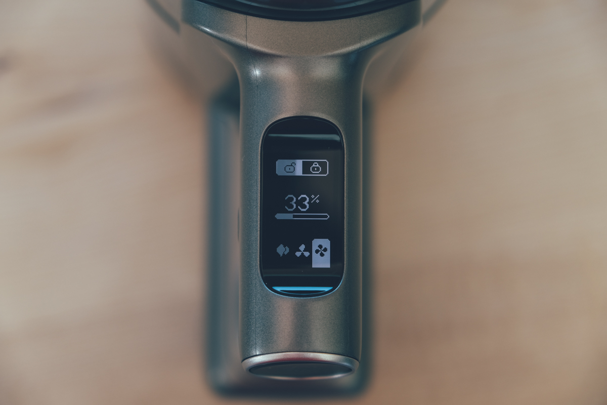 上面的 OLED 顯示螢幕資訊很詳細,包括有目前的鎖定狀態、電量以及吸力模式,當你在使用時也會顯示預估剩餘可用時間,以便我們在使用時查看。