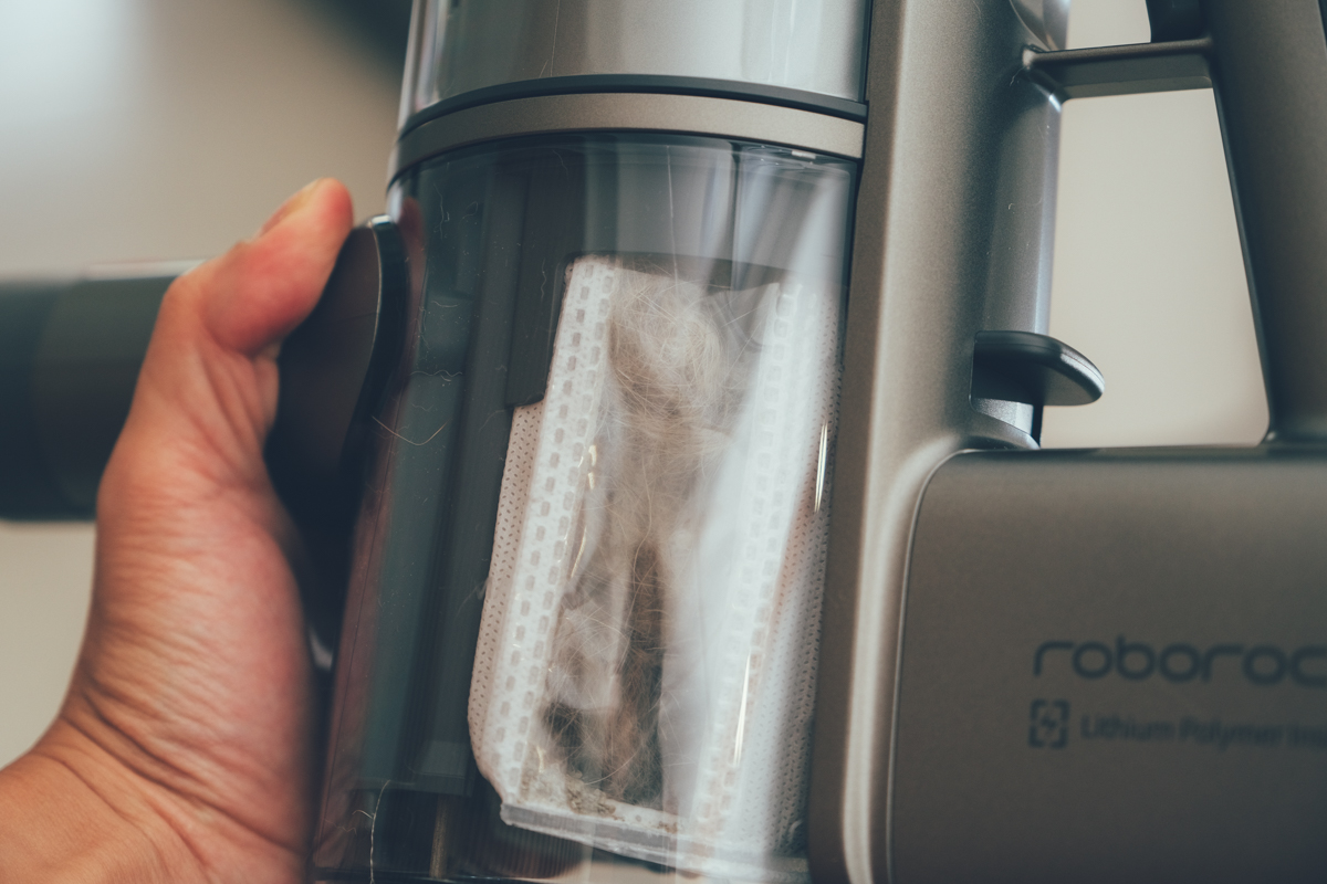 阿湯有另一個很喜歡的設計,就是集塵桶是可以「很輕鬆」的全部拆卸,包括不鏽鋼濾網、高密度棉濾網,有些吸塵器的前方集塵桶雖然可以拆卸,不過有些設計的很難拆,一不小心可能還會弄壞零件,但石頭科技的設計真很方便。