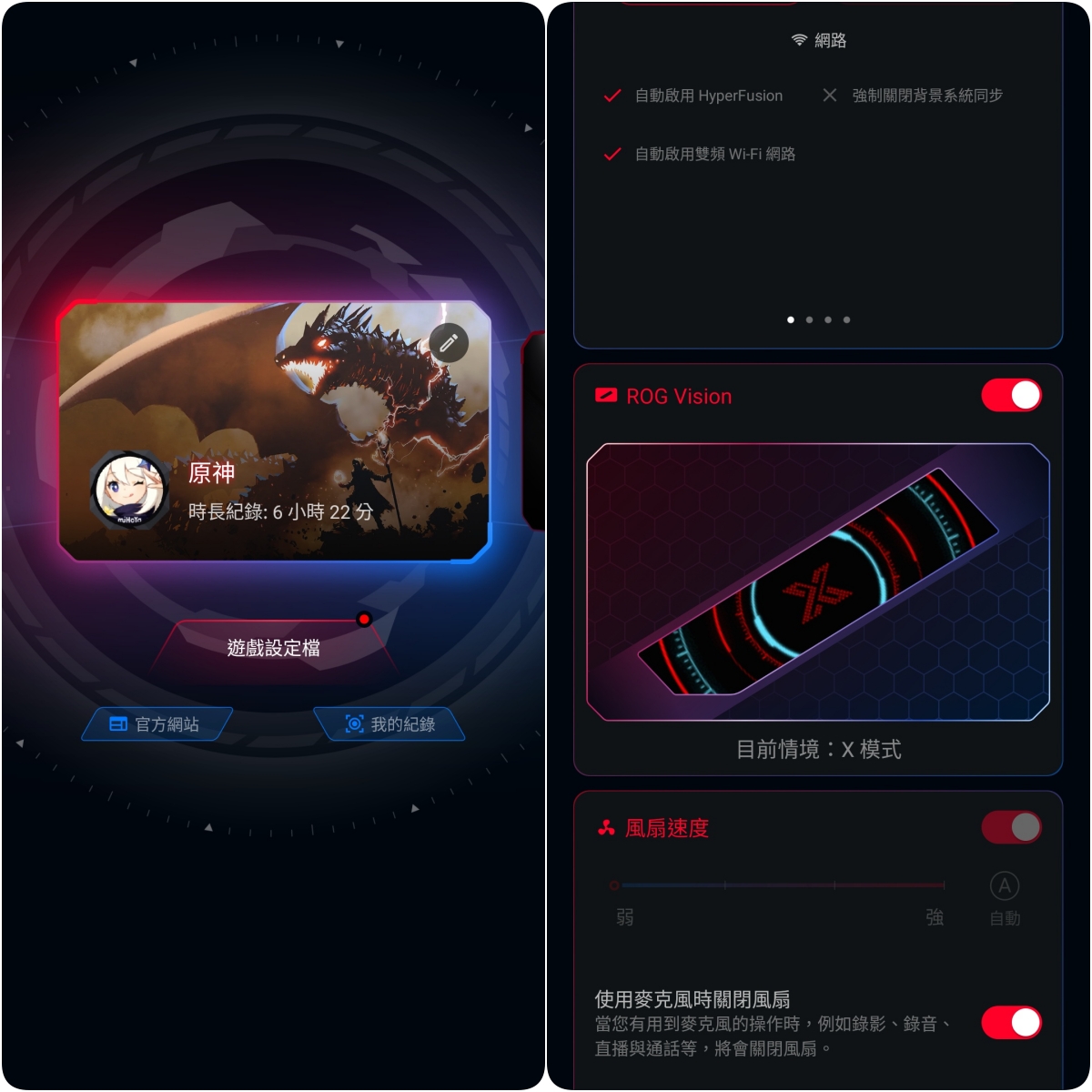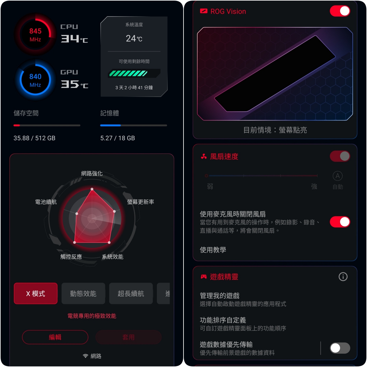 而要稱為一支電競手機,不能只是單純硬體規格高,那是遠遠不夠的,如果只是硬體規格超高但沒有良好的系統搭配,其實也就是一支規格高的手機,但不能說是好用的電競手機,ROG Phone 5s Pro 在系統面... 也不對,應該說 ROG 系列的電競手機一直以來在系統面都有相當程度的調校,像現在搭配的 ROG 的 Amoury Crate APP,就可以獨立的針對遊戲方面進行設定,像是效能模式的選擇,外接散熱風扇速度的調整,遊戲精靈的設定等,也能在這裡隨時查看 CPU 及 GPU 的狀況,這才是遊戲玩家真正需要的功能。