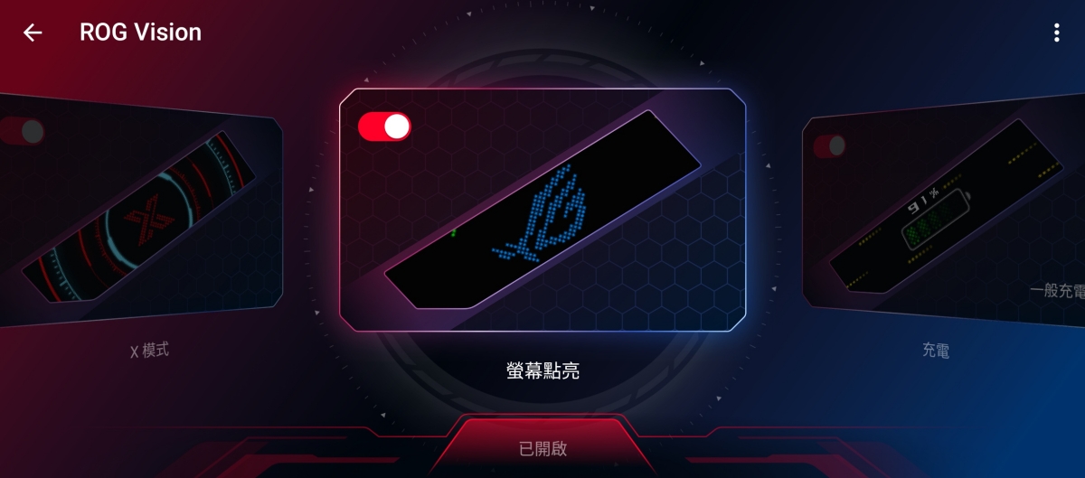 可以選擇哪些情況下背面的 ROG Vision 有作用,像是喚醒手機,切換成 X 模式、充電時,都可以自行個別設定是否要啟用。